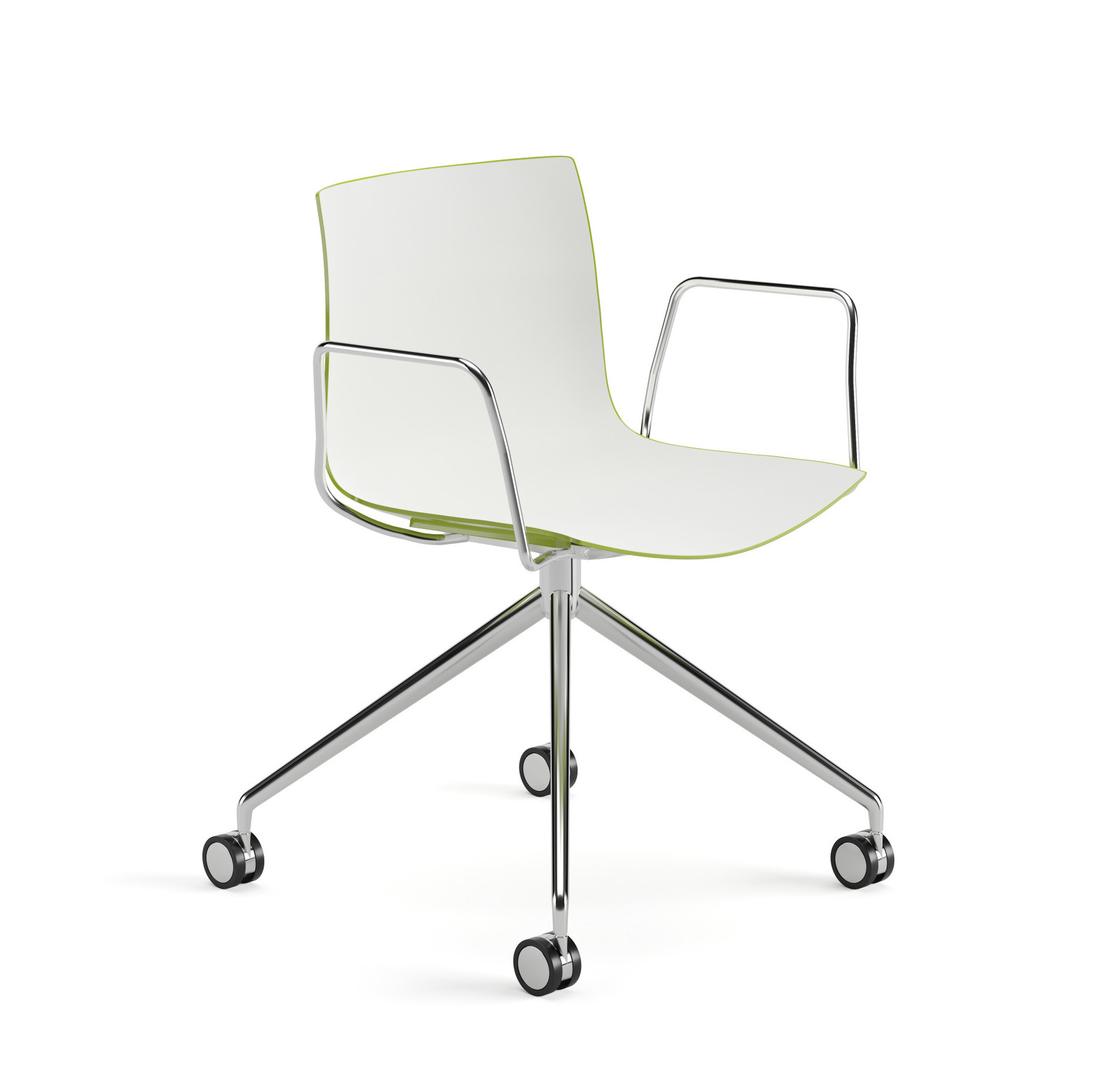 | Material: | Sitzelement auf fixem Fußgestell aus Aluminium glänzend oder lackiert, auf selbstbremsenden Rollen. Die Schale ist aus Polypropylen einfarbig, Polypropylen zweifarbig. |