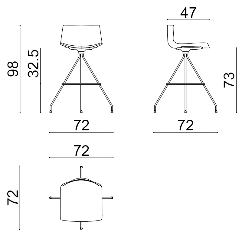| Material: | Barhocker auf Drehfuß aus verchromtem Stahl. Die Sitzschale mit niedriger Rückenlehne ist aus Polypropylen gepolstert, mit Weichleder, beschichtete Textilien, Stoff oder Kundenmaterial. Horizontale Nähte. |
