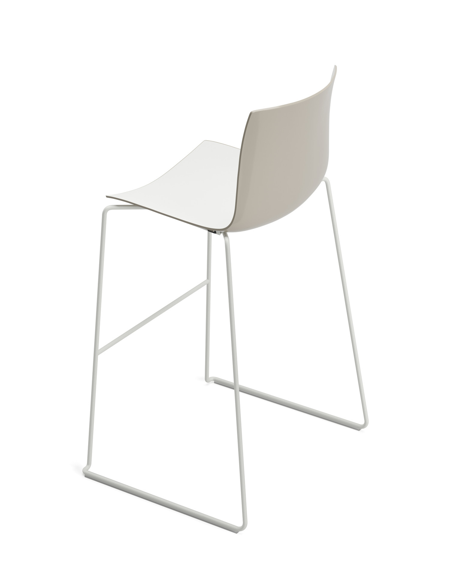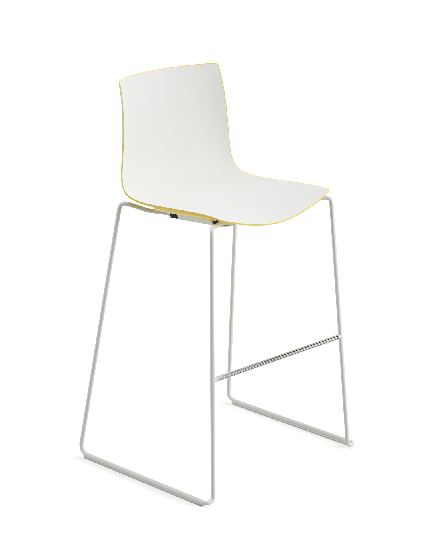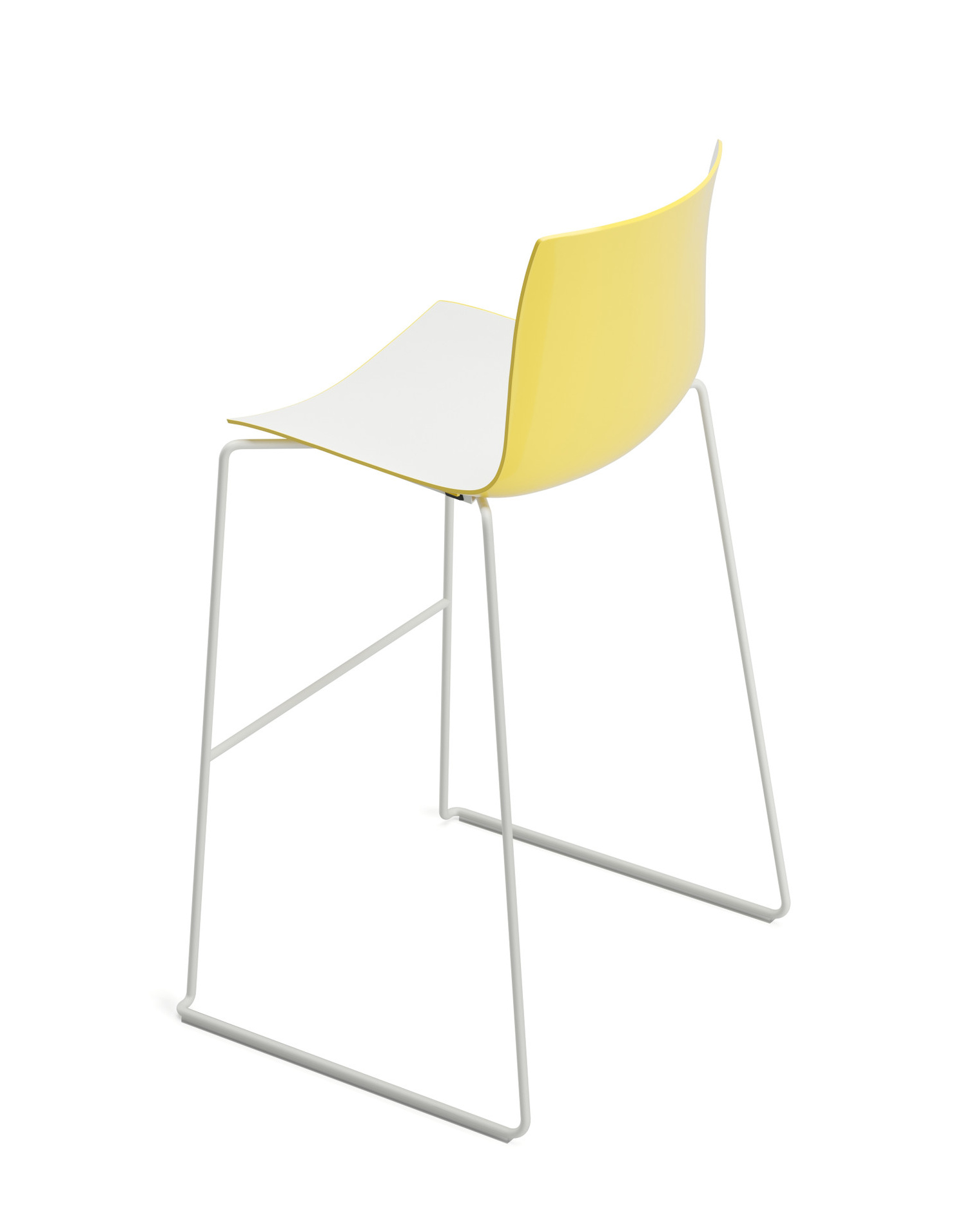 | Material: | Barhocker mit Kufengestell aus verchromtem oder lackiert Stahl, Schale aus Polypropylen einfarbig oder Polypropylen zweifarbig. |