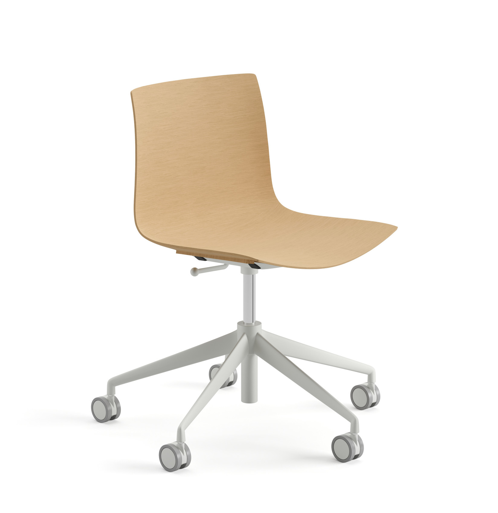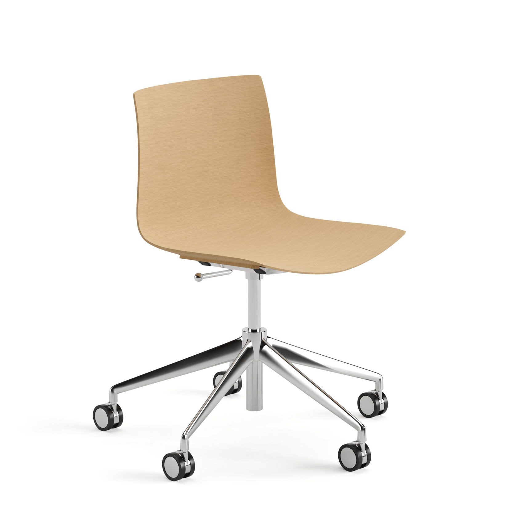 | Material: | Stuhl mit drehbarem fünfstrahligem Sternfuß aus glänzendem oder lackiertem Aluminium mit selbstbremsenden Rollen und Höhenverstellung mit Gasdruckfeder. Sitzschale mit multilaminiertem Furnier in Eichen-Optik, doppelt gebogen, und in drei Farbvarianten (Eiche natur, Eiche gebleicht, Wengé). |