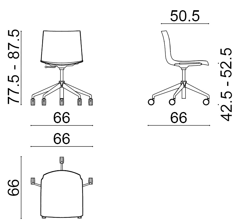 | Material: | Stuhl auf 5-strahligem Drehgestell aus glänzendem oder lackiertem Aluminium, auf selbstbremsenden Rollen, mit Gaslifter zur Höhenverstellung. Die Sitzschale besteht aus Polypropylen, und mit verklebtem Spiegelpolsterkissen aus Stoff, Leder, beschichtete Textilien, oder Kundenmaterial. |