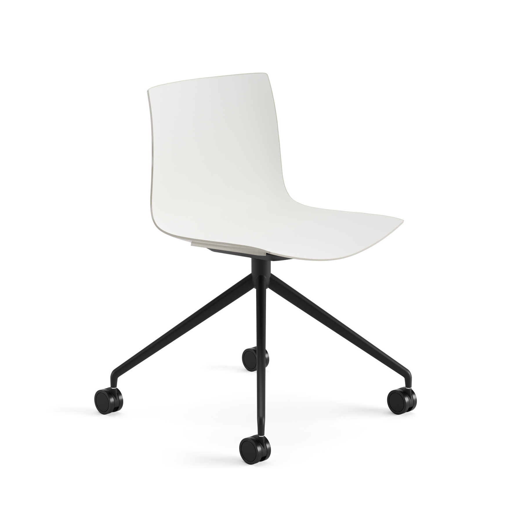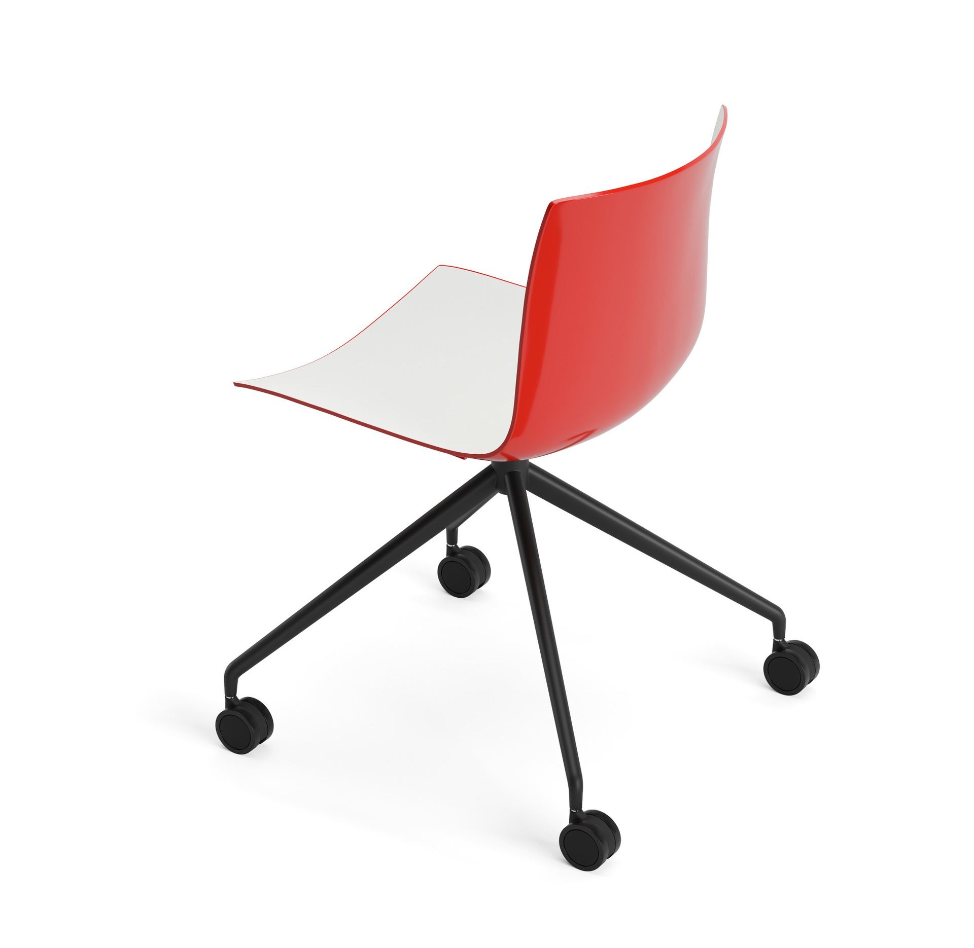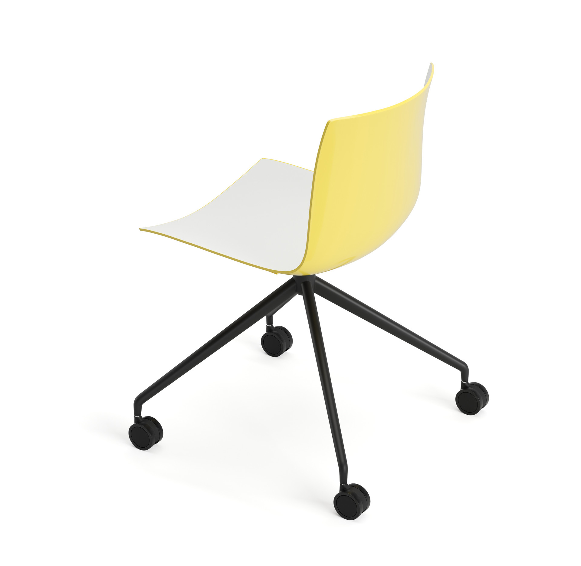 | Material: | Sitzelement auf fixem Fußgestell aus Aluminium glänzend oder lackiert, auf selbstbremsenden Rollen. Die Schale ist aus Polypropylen einfarbig, Polypropylen zweifarbig. |