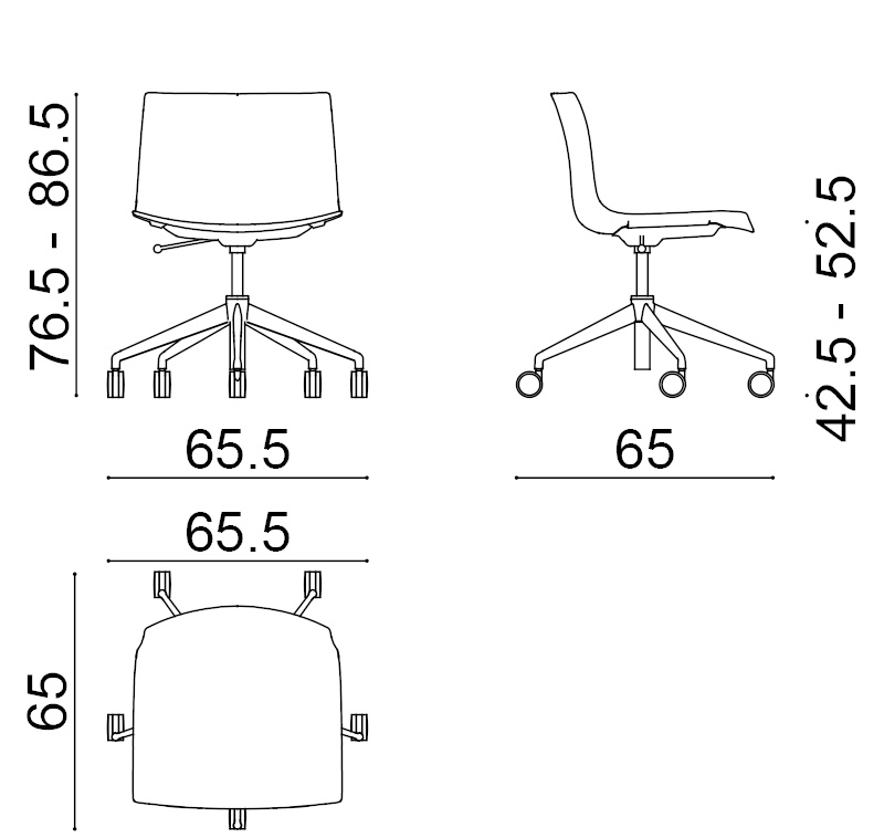 | Material: | Stuhl auf drehbarem fünfstrahligem Gestell aus glänzendem oder lackiertem Aluminium auf selbstbremsenden Rollen und mit Gasdruckfeder für Höhenverstellung. Schale aus einfarbigem Polypropylen oder bezogen mit Kernleder ohne Polsterung. |