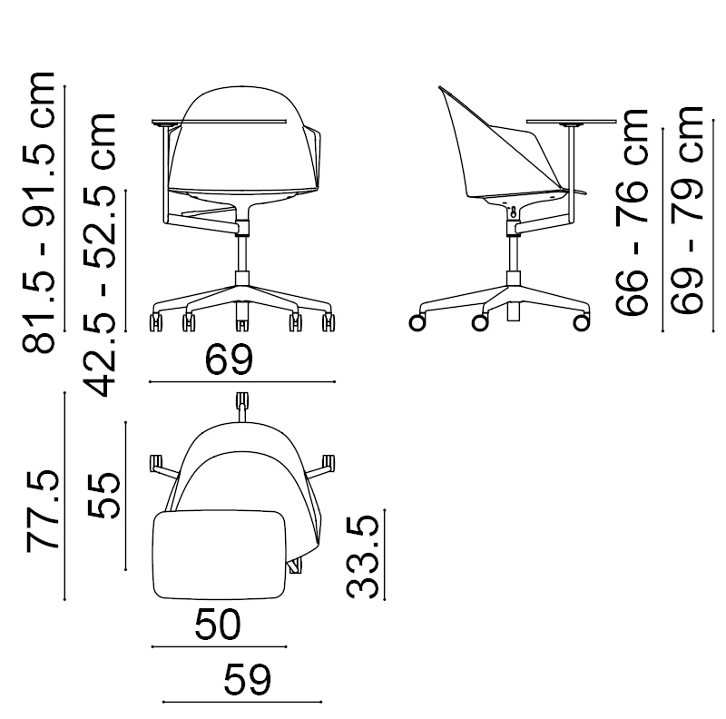 | Material: | Armsessel mit fünfstrahligem Drehfuß aus glasfaserverstärktem Nylon (in Weiß oder Schwarz) mit selbstbremsenden Rollen (in der gleichen Farbe wie das Gestell) und komplett mit Schreibbrett 50x33,5 cm aus HPL, Schreibfläche und Arm drehbar, in der gleichen Farbe wie das Gestell). Sitzschale aus Polypropylen in fünf Farben. |