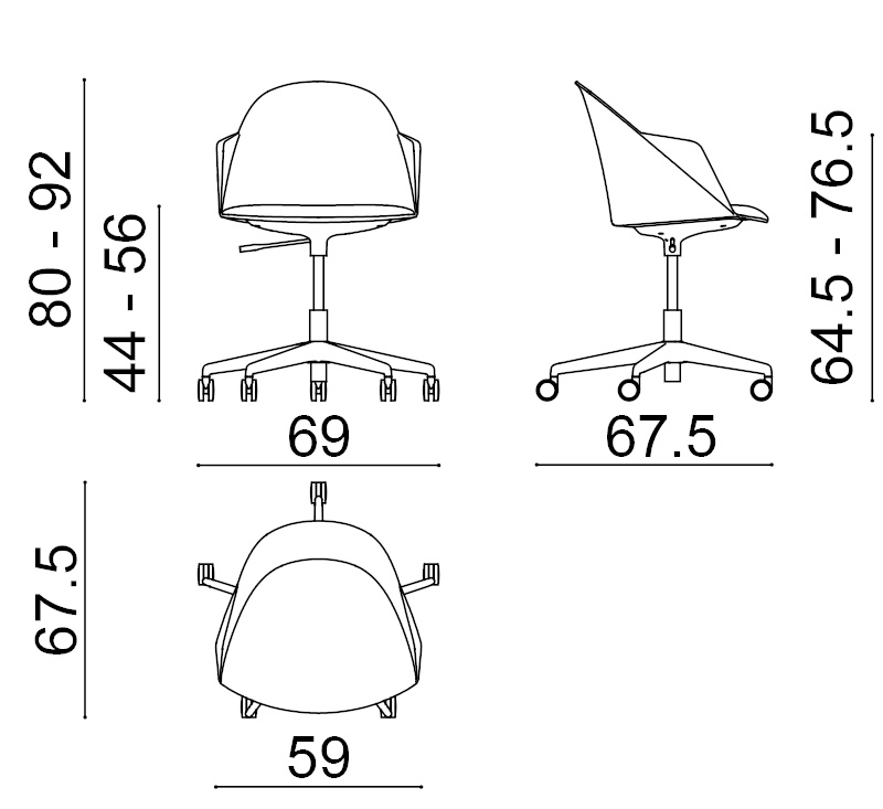 | Material: | Armsessel mit fünfstrahligem Drehfuß aus glasfaserverstärktem Nylon (in Weiß oder Schwarz) mit selbstbremsenden Rollen (in der gleichen Farbe wie das Gestell) und komplett mit Schreibbrett 50x33,5 cm aus HPL, Schreibfläche und Arm drehbar, in der gleichen Farbe wie das Gestell). Sitzschale aus Polypropylen in fünf Farben mit Sitzkissen aus Stoff, Leder, beschichtete Textilien oder Bezug des Kunden. |