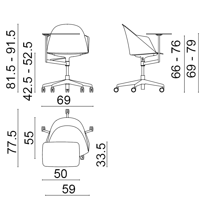 | Material: | Armsessel mit fünfstrahligem Drehfuß aus glasfaserverstärktem Nylon (in Weiß oder Schwarz) mit selbstbremsenden Rollen (in der gleichen Farbe wie das Gestell) und komplett mit Schreibbrett 50x33,5 cm aus HPL, Schreibfläche und Arm drehbar, in der gleichen Farbe wie das Gestell). Sitzschale aus Polypropylen in fünf Farben mit Sitzkissen aus Stoff, Leder, beschichtete Textilien oder Bezug des Kunden. |