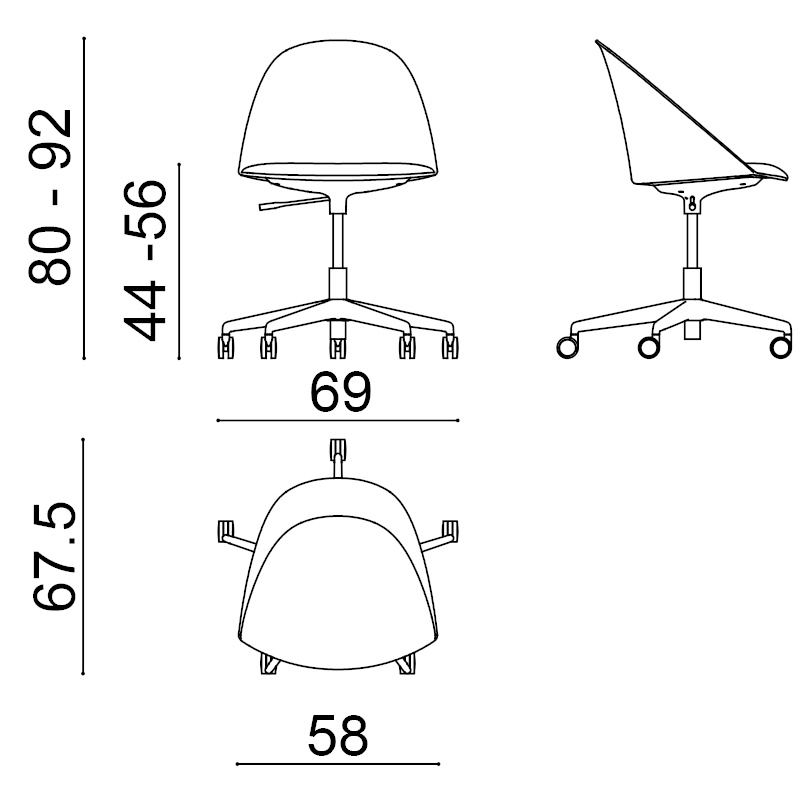 | Material: | Stuhl mit fünfstrahligem Drehfuß aus glasfaserverstärktem Nylon (in Weiß oder Schwarz) mit selbstbremsenden Rollen (in der gleichen Farbe wie das Gestell). Sitzschale komplett bezogen mit Leder, beschichtete Textilien, Stoff oder Kundenmaterial. |