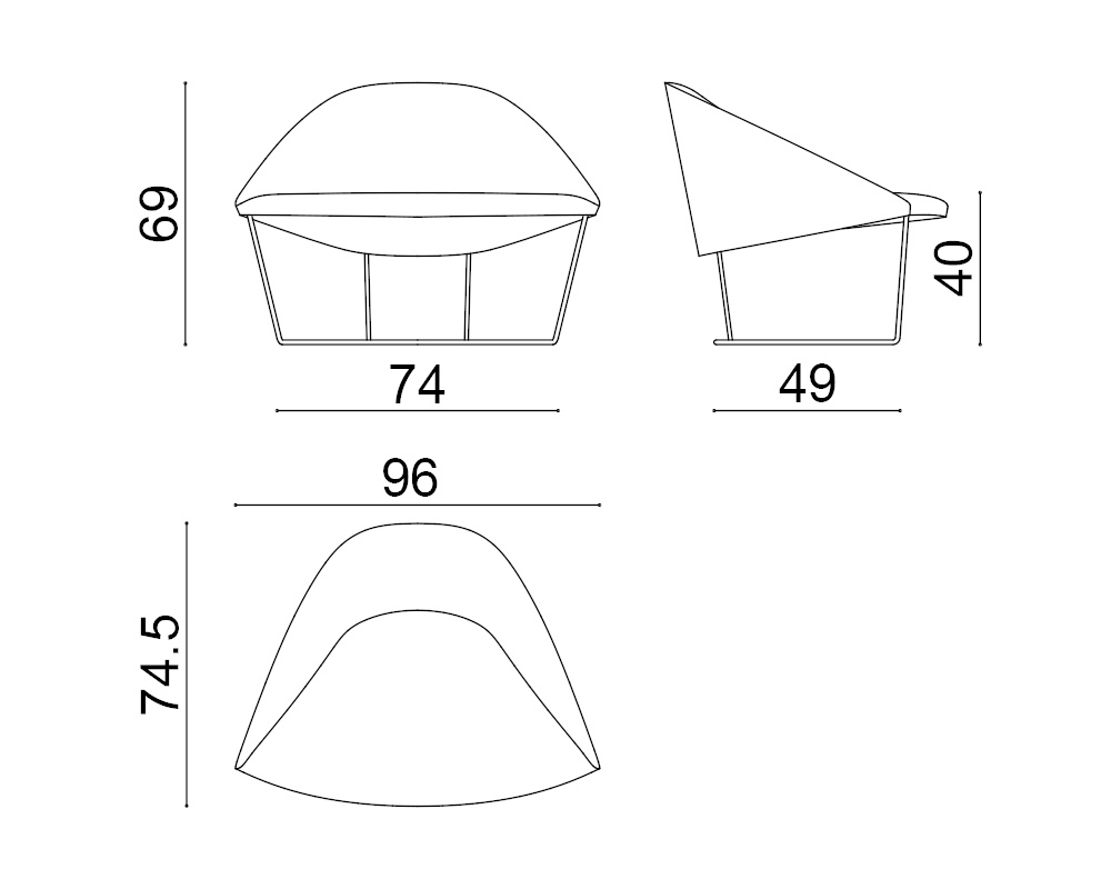 | Material: | Polstersessel mit Rahmen aus Sperrholz und Bezug aus Stoff, Kundenmaterial, Leder oder beschichtete Textilien. Metallgestell erhältlich in verchromtem Stahl oder in Stahl mit Lackierung in Anthrazitgrau. |