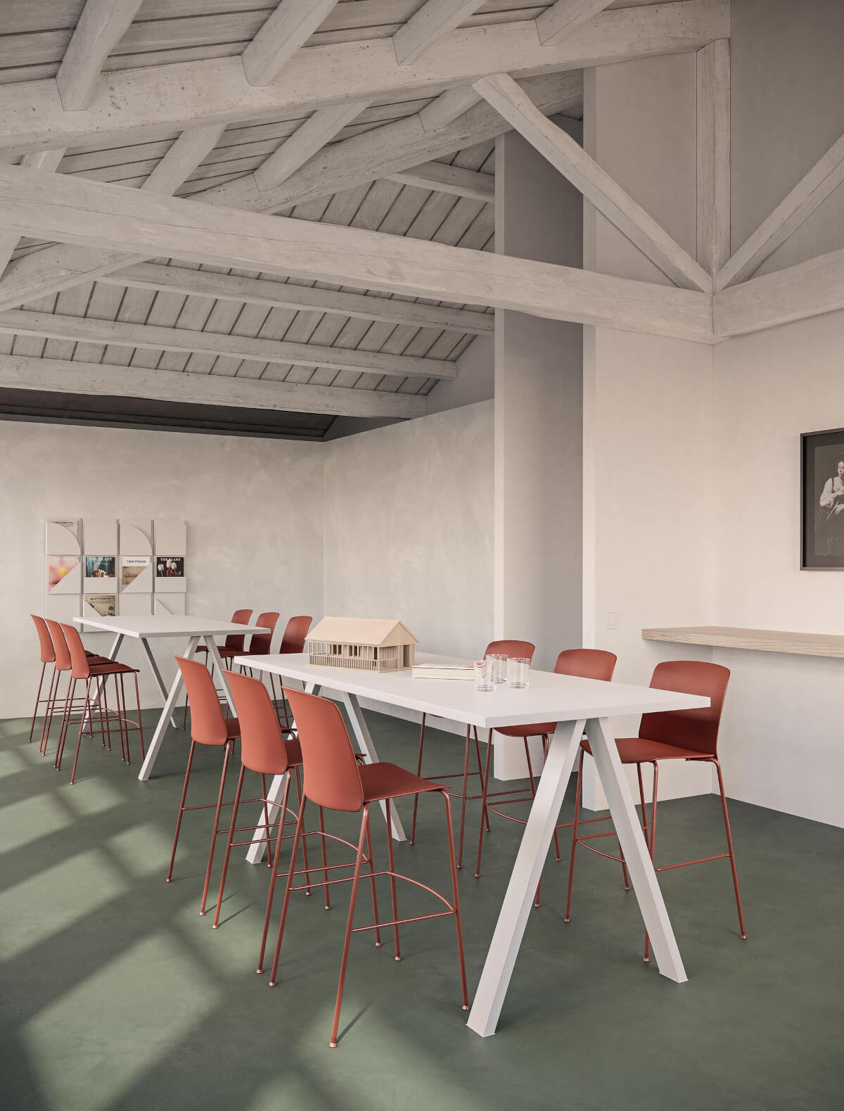 Die rechteckige Tischplatte misst 240 x 110 cm und ruht auf einem charakteristisch überkreuzten Untergestell aus Aluminium in Lackoptik. Der Arper Cross Konferenztisch ist in verschiedenen Oberflächen – von edlem Holzfurnier bis laminierter Ausführung – und in mehreren Farben erhältlich. Entworfen von den Designern Metrica, überzeugt er durch eine filigrane Ästhetik, ausgeprägte Stabilität und technologische Raffinesse. Ergänzende Größen und Sondermaße ermöglichen eine individuelle Anpassung an anspruchsvolle Raumgegebenheiten.