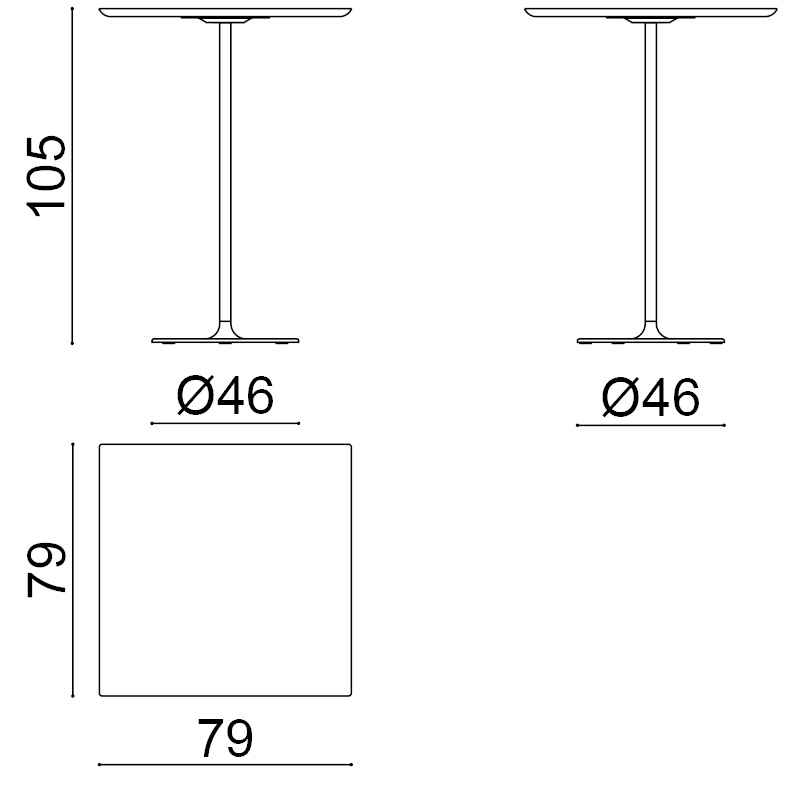 | Material: | Tisch mit rundem Gestell aus glänzend weiß oder matt schwarz lackiertem Stahl. Platte aus Fenix®-Laminat (Dicke 2,6 cm). |