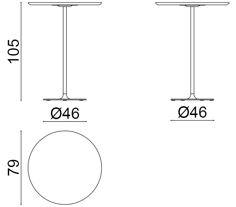 | Material: | Tisch mit rundem Gestell aus glänzend weiß oder matt schwarz lackiertem Stahl. Platte aus Fenix®-Laminat (Dicke 2,6 cm). |