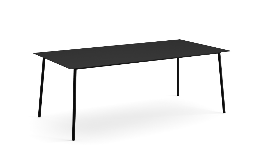 | Material: | Rechteckiger Tisch mit vierbeinigem Gestell aus Metall und Platte aus gebogenem und lackiertem Stahlblech (Dicke 4 mm). |
