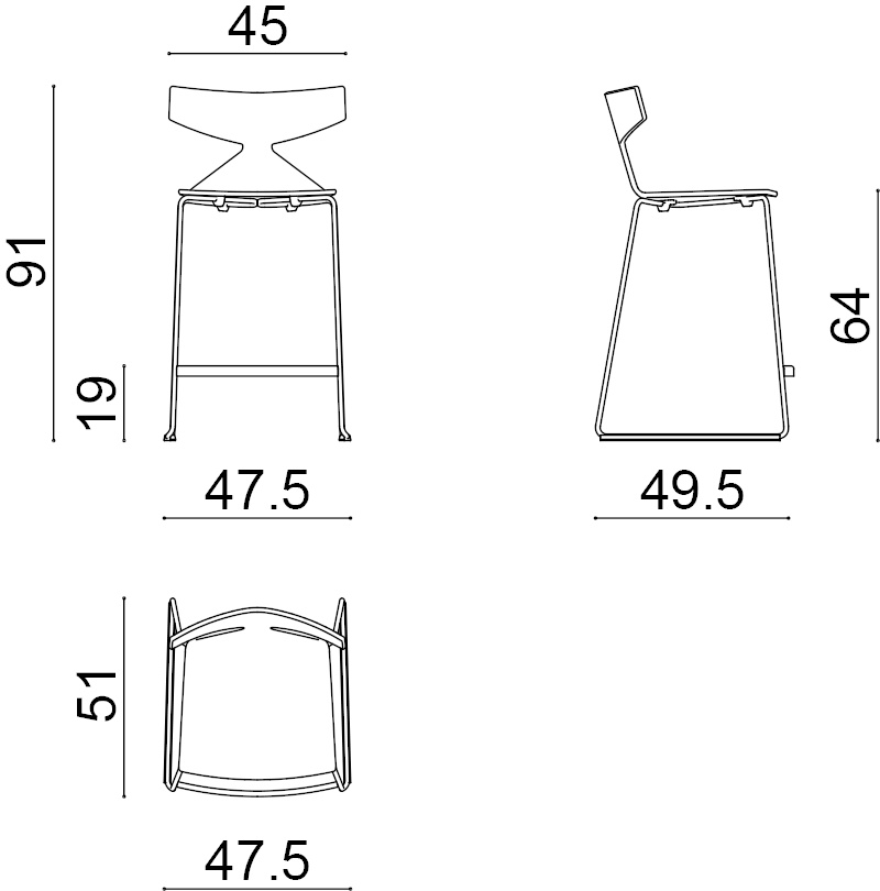 | Material: | Hocker mit Kufengestell aus verchromtem oder lackiertem Stahl und Sitzschale aus Holz mit Eichen-Schälfurnier. |
