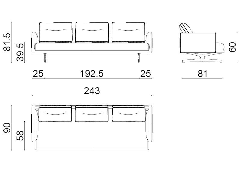 | Material: | Dreisitzer-Sofa mit Gestell aus Metall und Holz, „T“-Bein aus lackiertem Aluminium. Äußeres Gestell und innere Kissen bezogen mit Stoff, Leder, beschichtetem Stoff oder einem Kundenmaterial. |