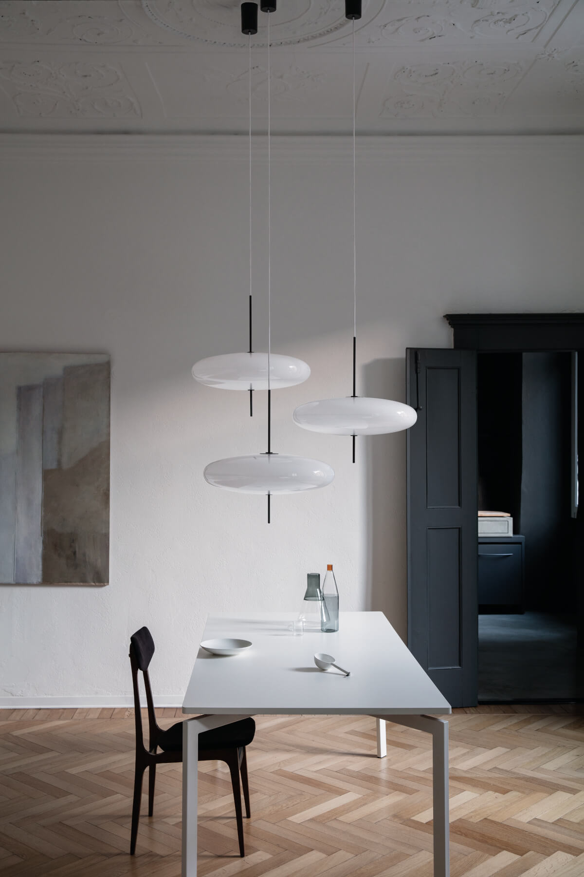 Mit der Model 2065 Pendelleuchte präsentiert Astep eine Leuchte, die Poesie und Präzision aufs Schönste vereint. Ein subtiler Dialog feinster Materialien begegnet einer klaren, skulpturalen Form, die das Spiel aus Licht und Schatten im Raum inszeniert. Die filigrane Silhouette des Opalglasschirms schwebt förmlich im Raum und entfaltet eine sanfte, gleichmäßige Lichtwirkung, die dem Ambiente eine warme, ruhige Atmosphäre verleiht. Funktionalität und Ästhetik greifen harmonisch ineinander, wodurch die Leuchte zum dezenten Mittelpunkt repräsentativer Räume wird – von der eleganten Wohnlandschaft bis zum stilvollen Büro. Die hochwertige Verarbeitung und das bemerkenswerte Design kreieren ein Lichtobjekt, das Modernität und Tradition mühelos vereint. Entworfen von Gino Sarfatti im Jahr 1950, besteht die Model 2065 Pendelleuchte aus mundgeblasenem Opalglas, ergänzt durch ein schlankes, schwarz eloxiertes Aluminiumgestänge. Mit einem Durchmesser von 53 Zentimetern und einer Höhe von 54 Zentimetern vermittelt sie klare Präsenz, ohne aufdringlich zu wirken. Ganz in Schwarz und Weiß gehalten, überzeugt sie durch ihre vielseitige Kombinierbarkeit. Die Leuchte ist in verschiedenen Varianten erhältlich.Model 2065 Pendelleuchte – Hochwertige Materialien, ikonisches Design