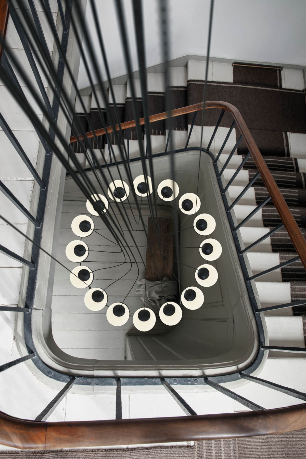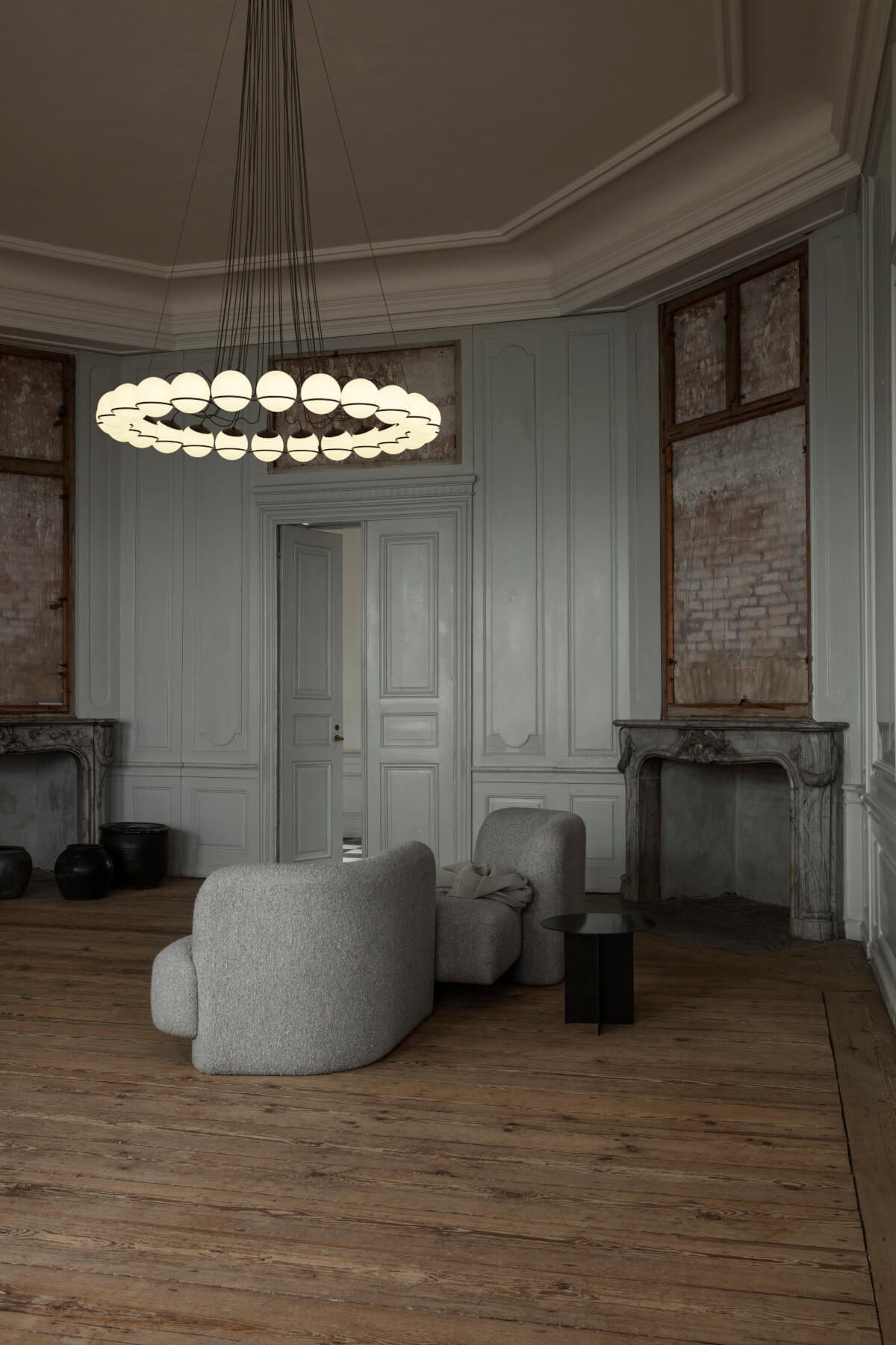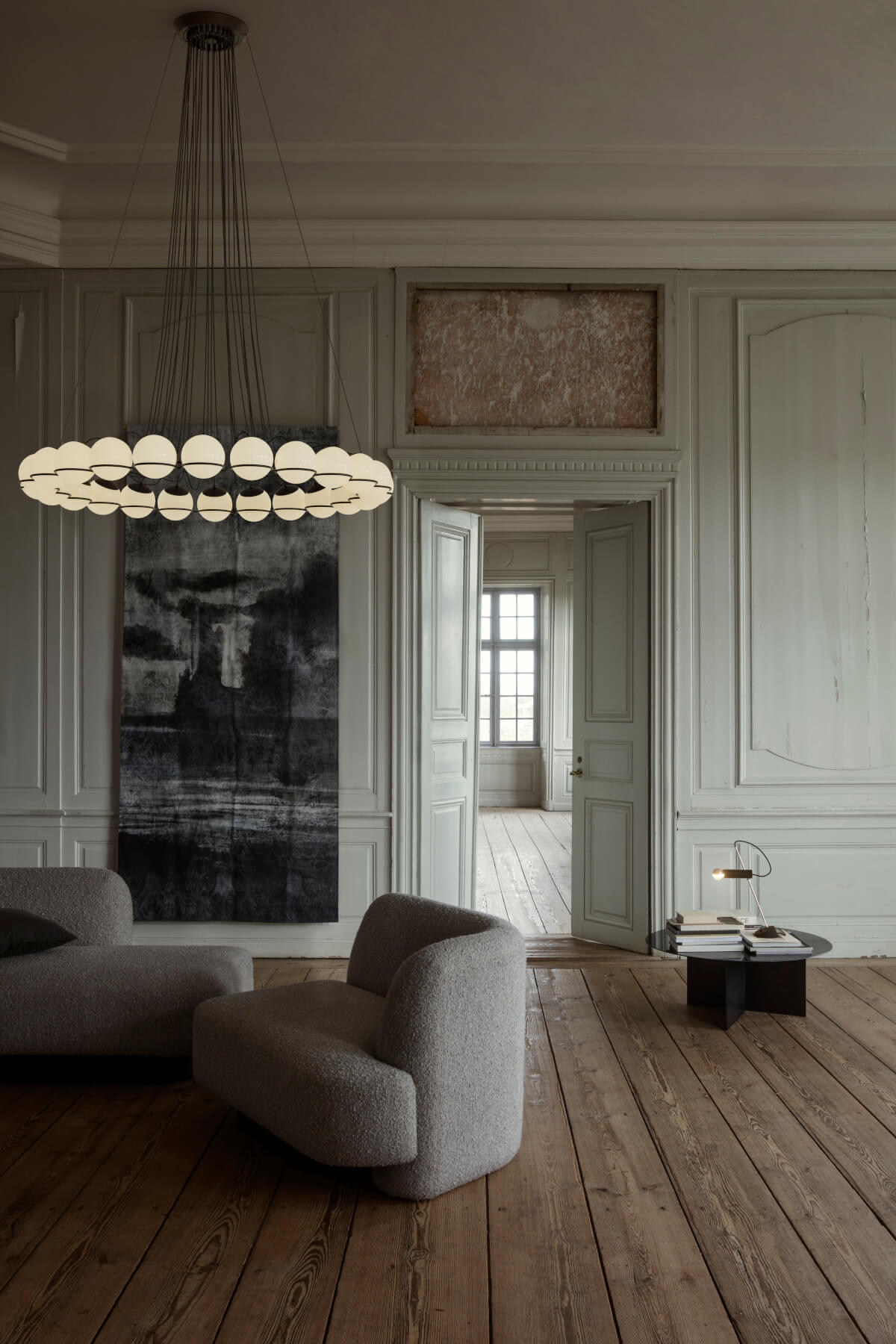 | Details: | Der Le Sfere Kronleuchter besteht aus einer kreisförmigen Anordnung von Kugeln aus geblasenem Opalglas. Jede Kugel wird von einer großen, schwarz oder champagnerfarben lackierten Stahlringstruktur gehalten. Die Kugeln können nach unten oder nach oben ausgerichtet werden, um eine direkte oder indirekte Beleuchtung zu ermöglichen. |