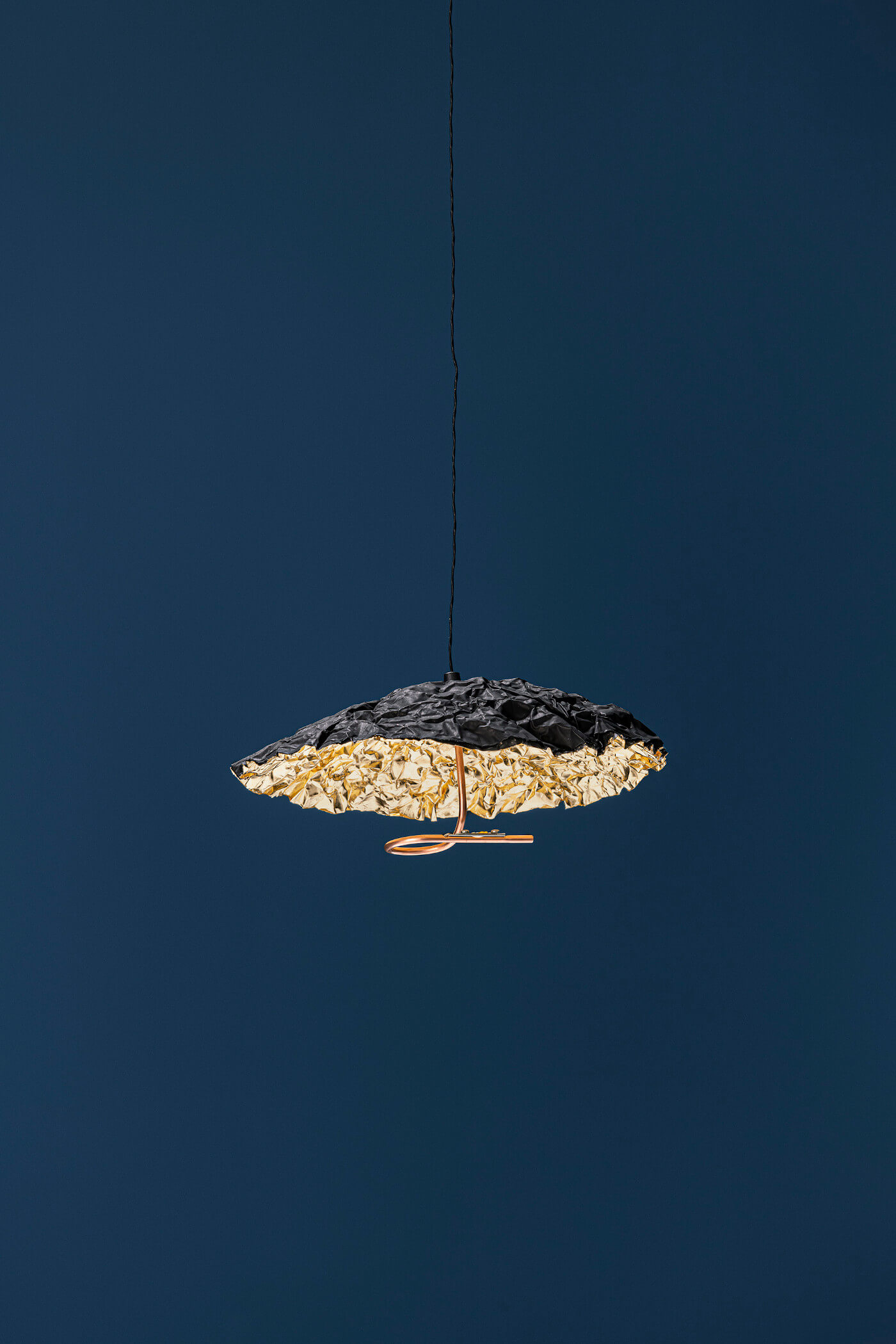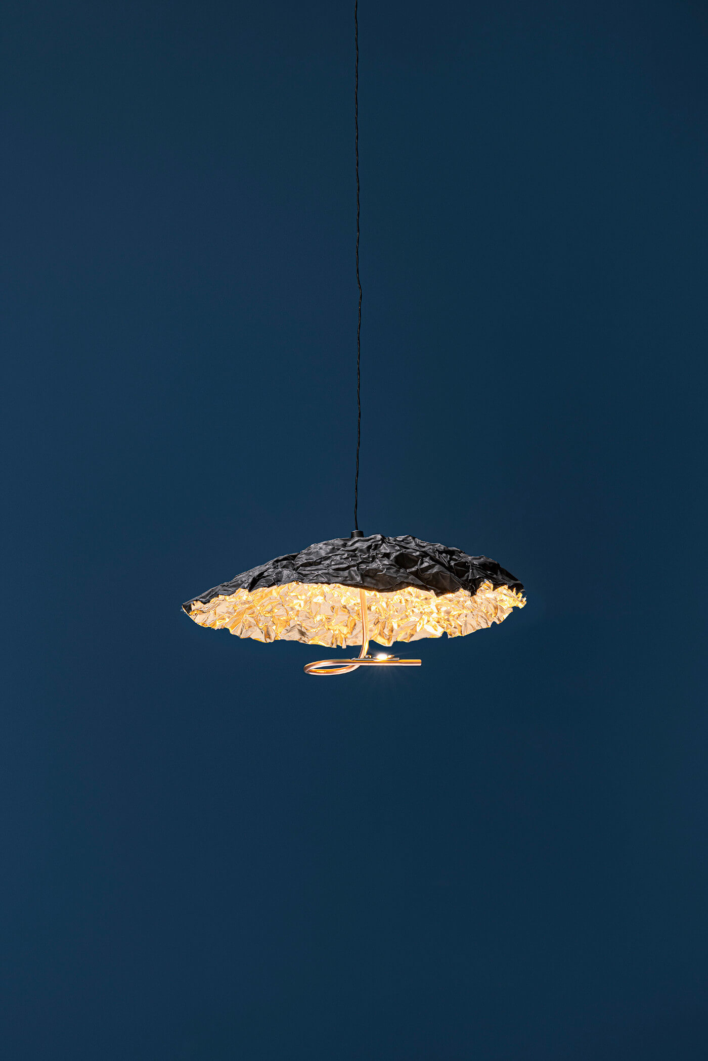 | Material: | Schwarzes Kabel, Kupferspirale, Nickel-Deckenanschluss (Modell JC) oder Nickel-Einbauplatte mit Seilspanner (Modell IC), Schirme in Schwarz/Gold. |