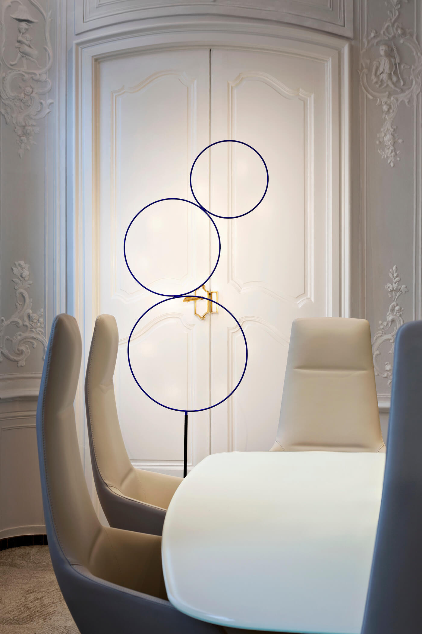 Die Sorry Giotto Stehleuchte von Catellani & Smith entfaltet im Raum eine stille, zeitlose Präsenz und zelebriert die Verschmelzung von Licht, Design und Kunst. Das leuchtend blaue Rund formt sich, getragen von filigraner Zurückhaltung, zu einer charakterstarken Silhouette, die gleichzeitig Leichtigkeit und Substanz ausstrahlt. In exklusiven Wohnkonzepten, modernen Lofts oder puristischen Geschäftsumgebungen wird die Stehleuchte zum stillen Statement von Persönlichkeit, Stil und feinem ästhetischen Gespür. Ihr indirektes, warmes Licht setzt ungewöhnliche Akzente, dabei dominiert eine Atmosphäre aus Ruhe und Klarheit. Catellani & Smith gelingt mit der Sorry Giotto Stehleuchte das seltene Gleichgewicht zwischen kompromissloser Formtreue und poetischer Ausstrahlung – ein Lichtobjekt, das jeden Raum kultiviert und zugleich subtil verwandelt. Mit einer Höhe von 183 cm und einem Durchmesser von 90 cm definiert Sorry Giotto die Proportionen großzügig und monumental. Der grazile Stab und der von Hand gefertigte, kobaltblaue Leuchtenring werden aus Eisen und Messing gearbeitet und mit einem blauen Pigment überzogen. Entworfen wurde die Leuchte vom renommierten Designer Enzo Catellani. Über einen Fußdimmer ist die Lichtintensität individuell regulierbar. Verschiedene Modellvarianten und Sonderausführungen sind auf Anfrage erhältlich.Sorry Giotto Stehleuchte – Meisterhafte Verarbeitung, ikonischer Charakter