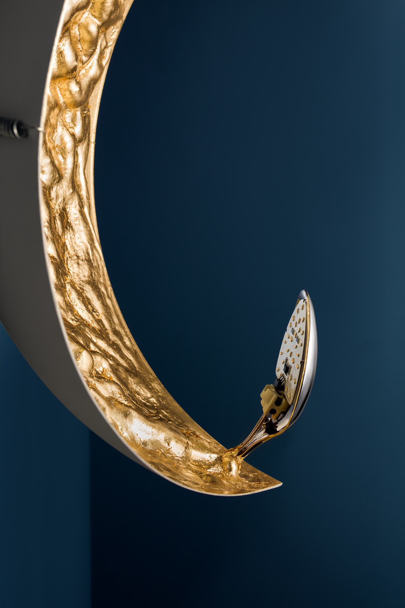 Mit einem Durchmesser von 80 Zentimetern und einer Tiefe von 18 Zentimetern erscheint die Catellani & Smith Stchu Moon 05 in großzügiger Dimension und wird aus Aluminium mit handapplizierter Blattgold- oder Blattsilberveredelung gefertigt. Entwickelt von Enzo Catellani, steht die Wandleuchte wahlweise in unterschiedlichen Oberflächenvarianten zur Verfügung und harmoniert perfekt mit verschiedenen Einrichtungsstilen.