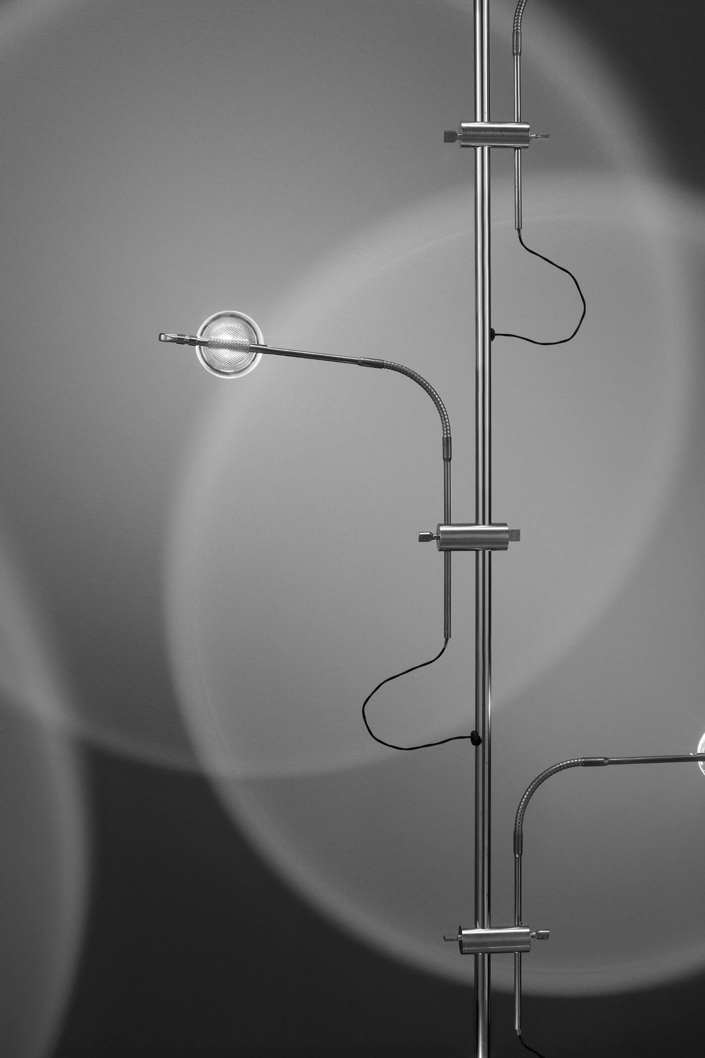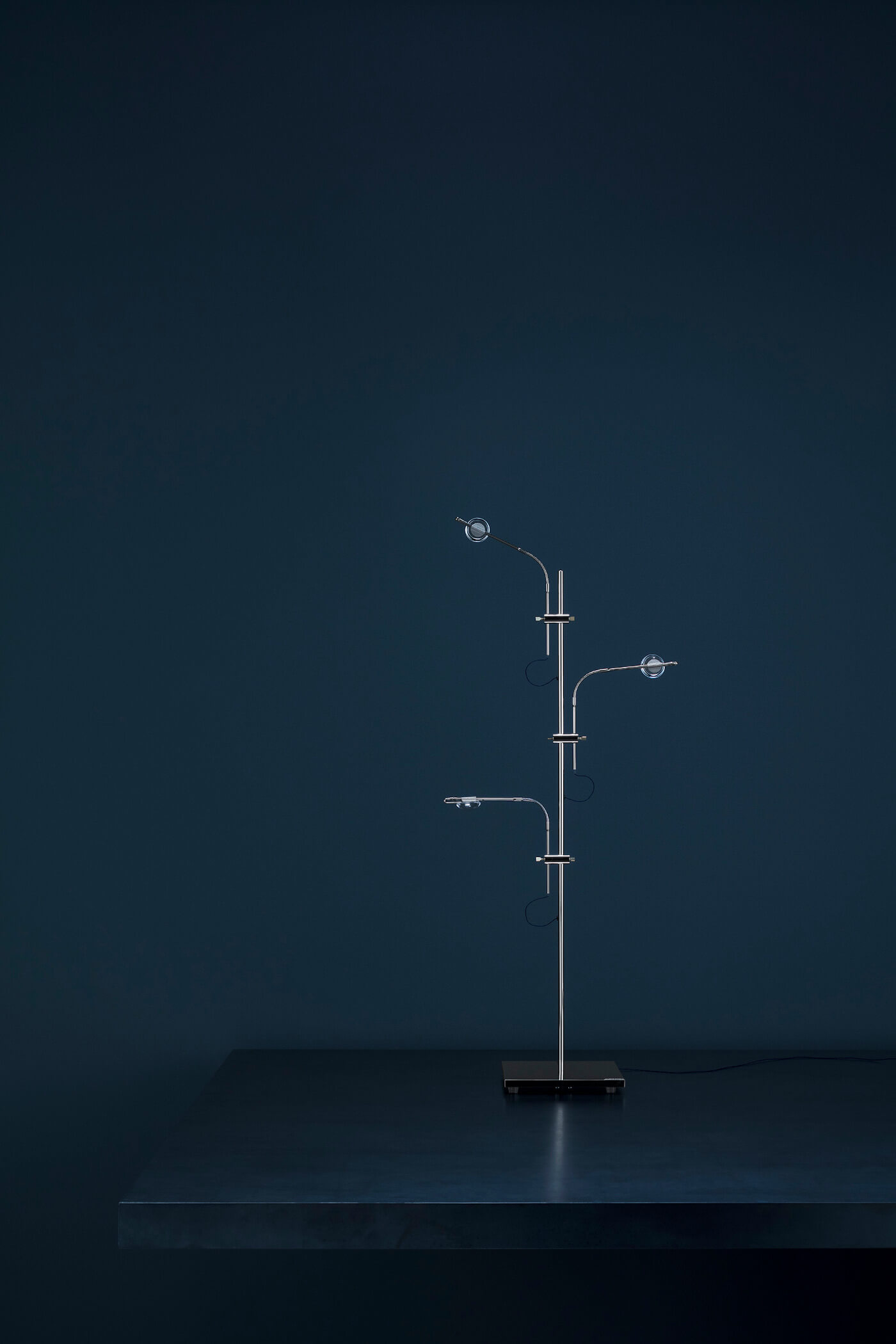 Die Wa Wa Tischleuchte misst in ihrer Standardausführung 55 cm in der Höhe, ihr Stab besteht aus edlem, handgearbeitetem Messing oder Nickel. Die flexiblen Lichtarme sind individuell ausrichtbar, während Linsen aus hochwertigem Borosilikatglas für gezielte Lichtbrechung sorgen. Konzipiert wurde die Leuchte von Enzo Catellani, der damit die charakteristische Philosophie der Manufaktur eindrucksvoll interpretiert. Erhältlich sind verschiedene Oberflächen, was universelle Kombinationsmöglichkeiten im modernen Premium-Interieur eröffnet.