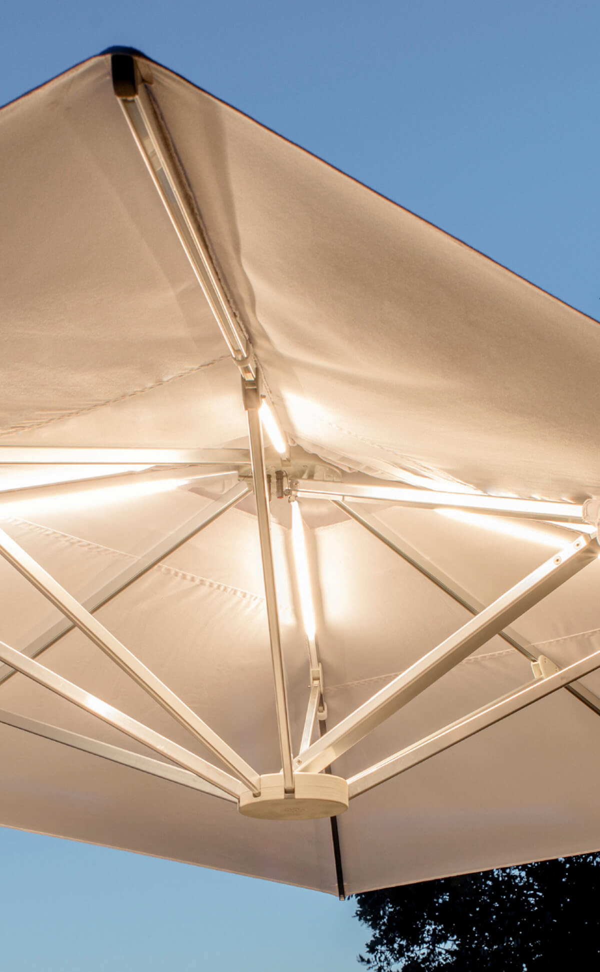 | Hinweis: | Die Bemaßung und die Hebel ermöglichen ein einfaches Schließen des Regenschirms, ohne dass Tische bewegt werden müssen, sowie die Möglichkeit, ihn in der horizontalen Ebene zu drehen. Shade Pro ist außerdem mit einem Beleuchtungssystem ausgestattet, das aus 4 LED-Leisten einer Fernbedienung und einer Schalttafel besteht. Die batteriebetriebene Fernbedienung verfügt über die folgenden Tasten: Zündung, Ausschaltung drei voreingestellte Lichtintensitäten, Auswahl zwischen warmem und kaltem Licht. |