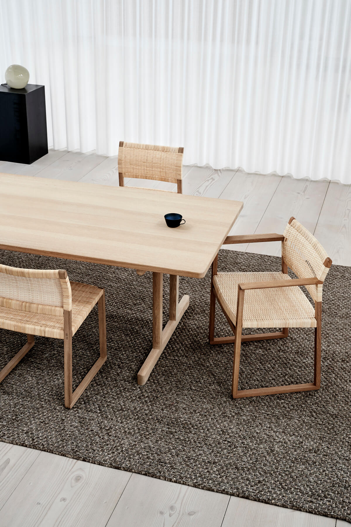 | Details: | Der Stuhl BM62 wurde 1958 von Børge Mogensen entworfen und basiert auf einer minimalen, aber äußerst robusten Konstruktion. Das strukturierte Design wird jedoch durch hervorragenden Komfort und sorgfältig gearbeitete Details bereichert, wie z. B. die freiliegenden Fingergelenke sowie Sitz und Rückenlehne aus Rohrgeflecht. |