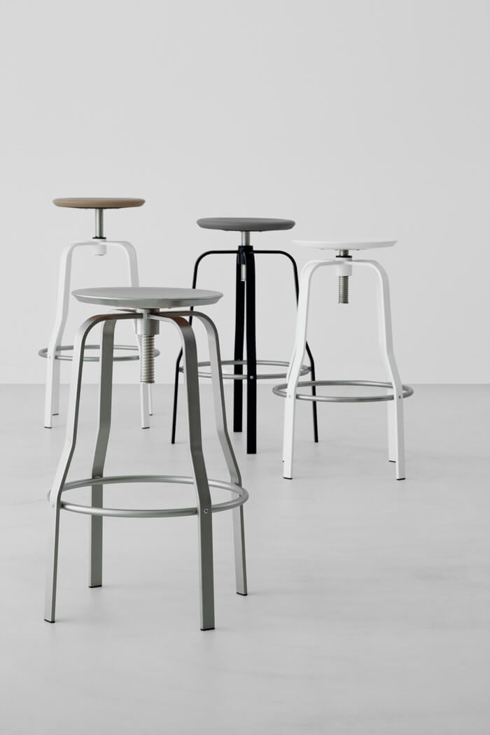 | Material: | Drehbarer Barhocker mit Höhenverstellung durch Gewinde. Gestell aus Edelstahl AISI 304, sandgestrahlt oder pulverlackiert. Fußstütze aus Edelstahl. Sitz aus formgepresstem Multiplex in verschiedenen Ausführungen. Gleiter aus Polyethylen. |