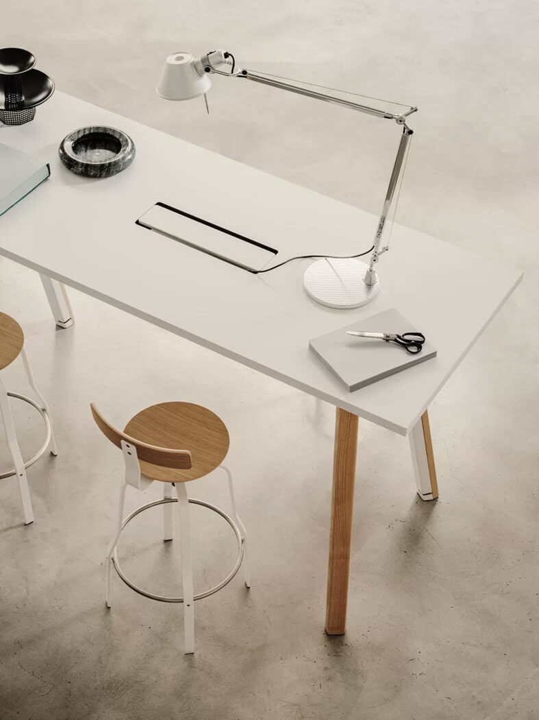 | Material: | Tischsystem mit Beinen aus gebogenem, pulverbeschichtetem Metall und massivem Eschenholz. Tischplatte aus MDF mit HPL Fenix® oder Eichenfurnier. |
