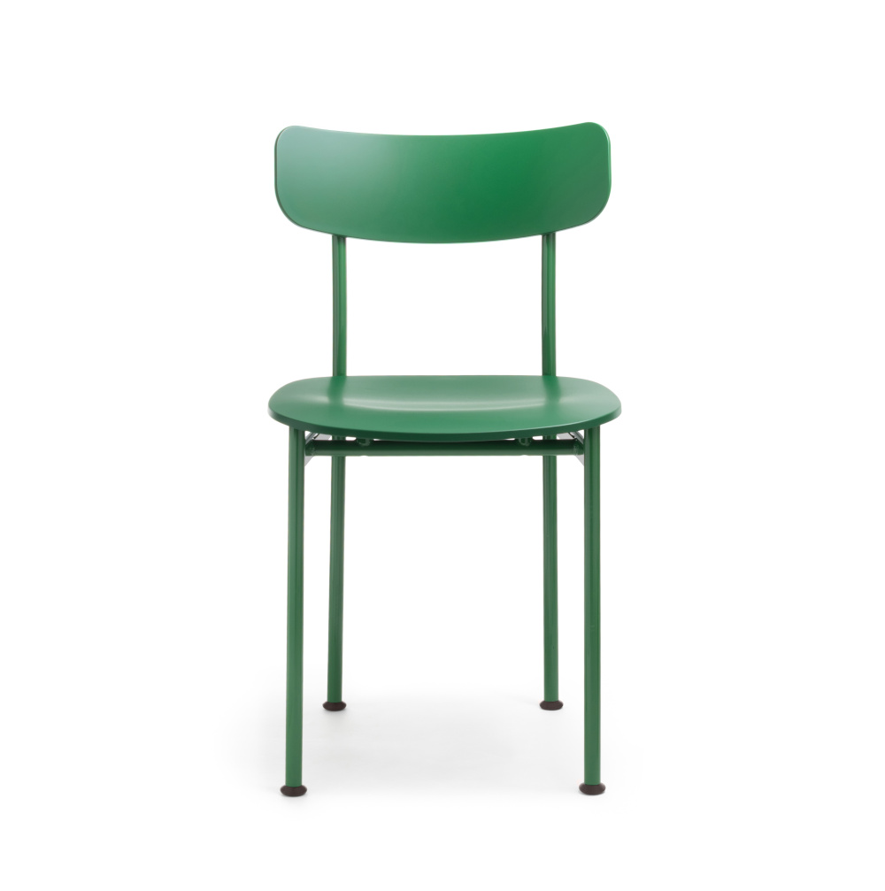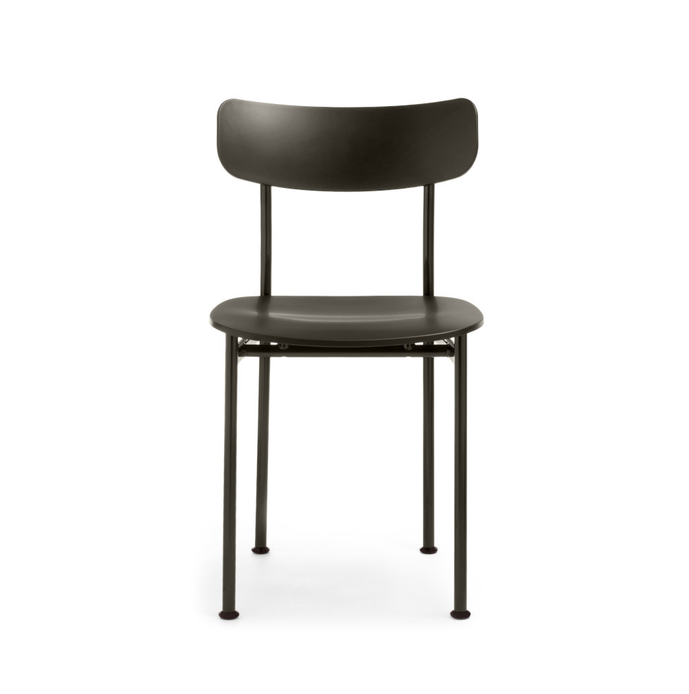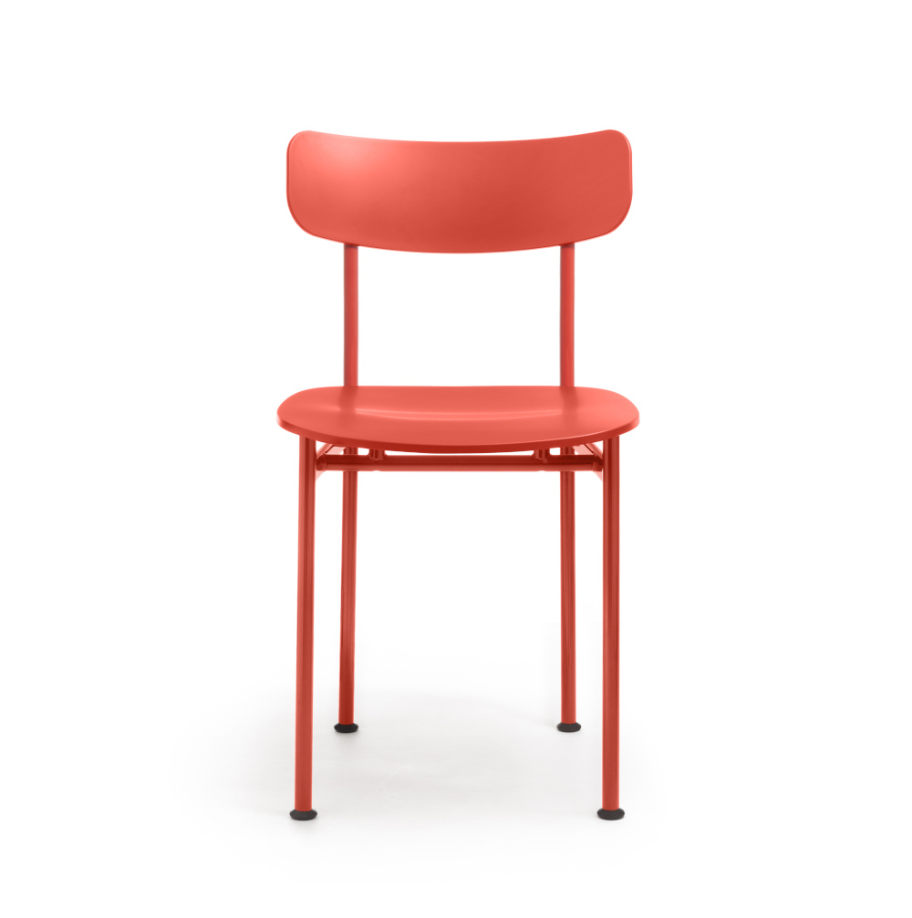 | Material: | Gestell aus Stahlrohr lackiert, glänzend. Sitz und Rückenlehne aus recyceltem Polypropylen. |