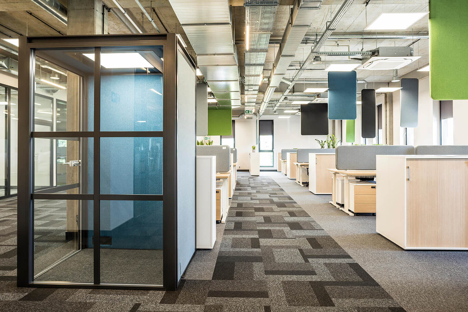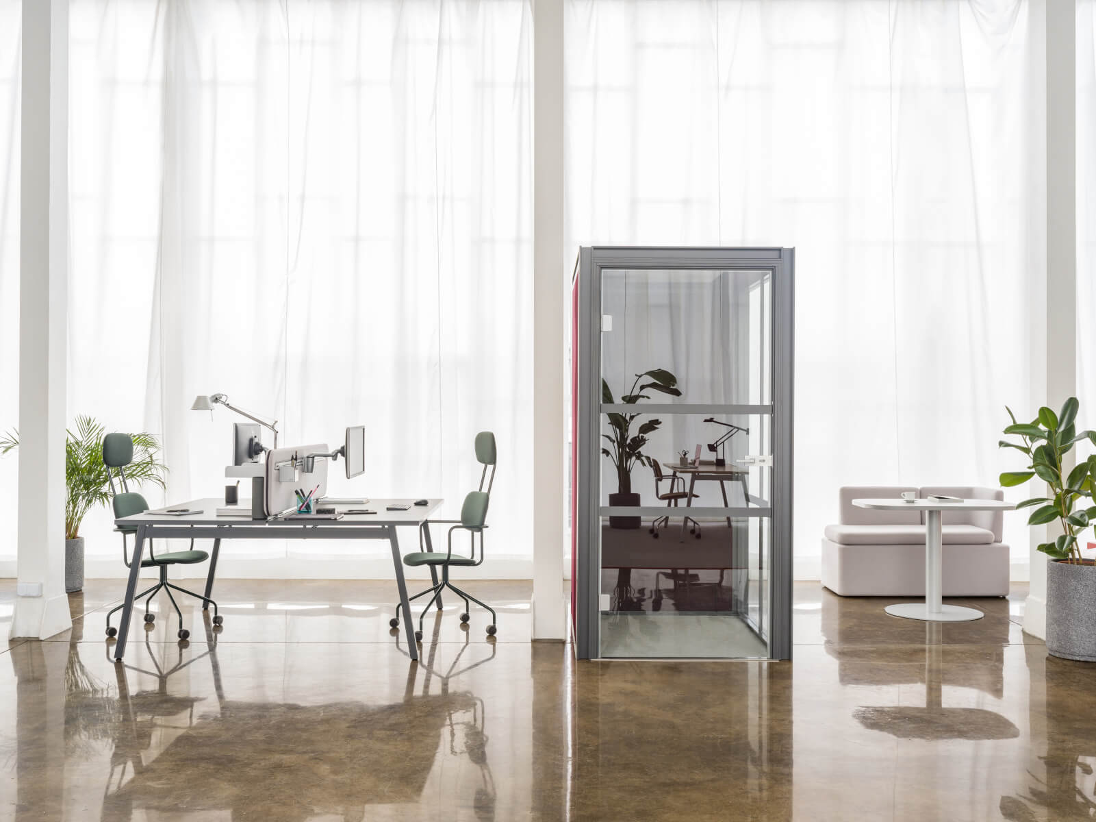 | Lüftung: | Die automatische Beleuchtung und ein leiser Lüfter unterstützen den Arbeitskomfort. Die Schallschutzkabinen garantieren die Privatsphäre von Gesprächen und Besprechungen und ermöglichen effiziente Flächenaufteilung, ohne dauerhafte Wände zu bauen. |