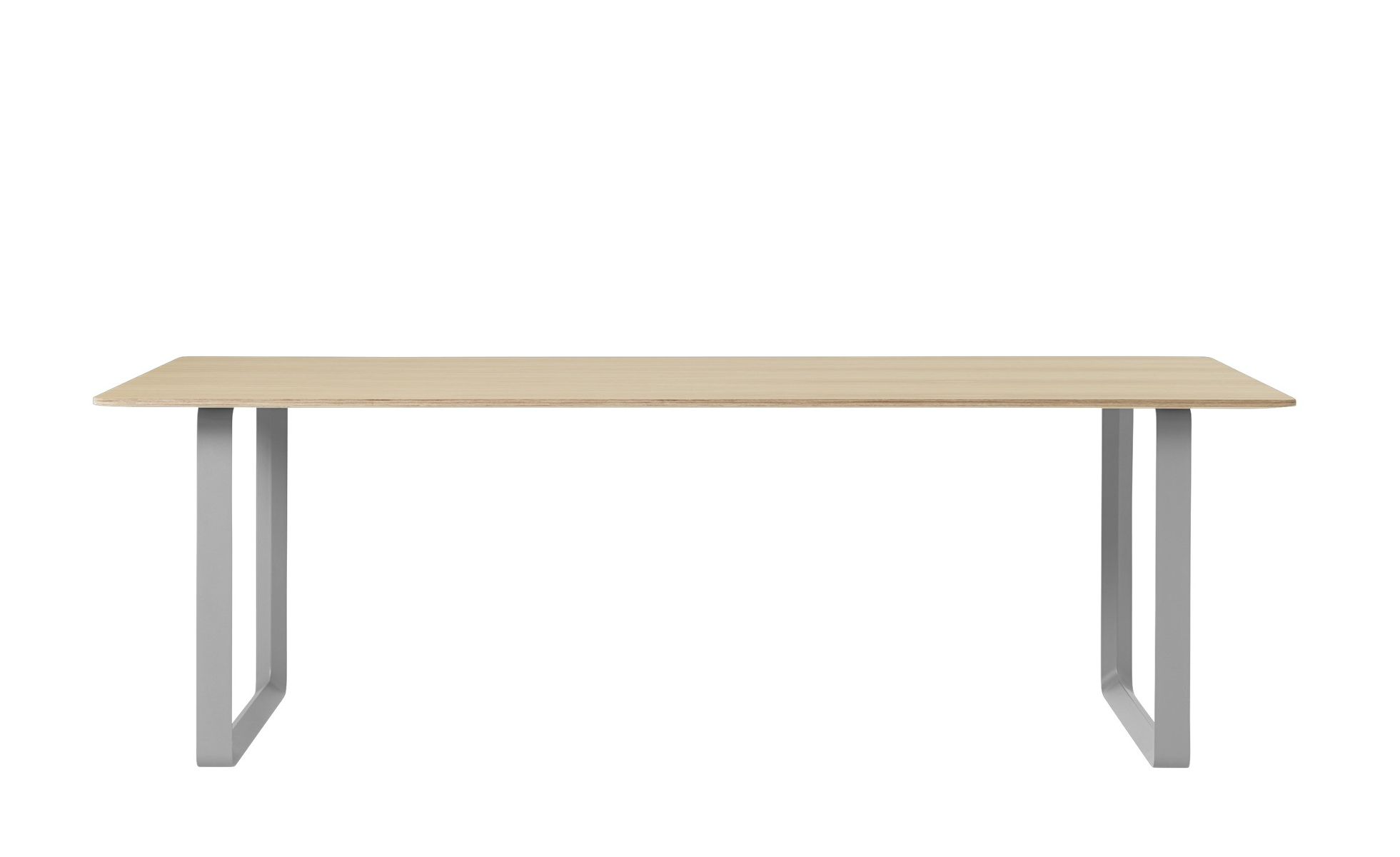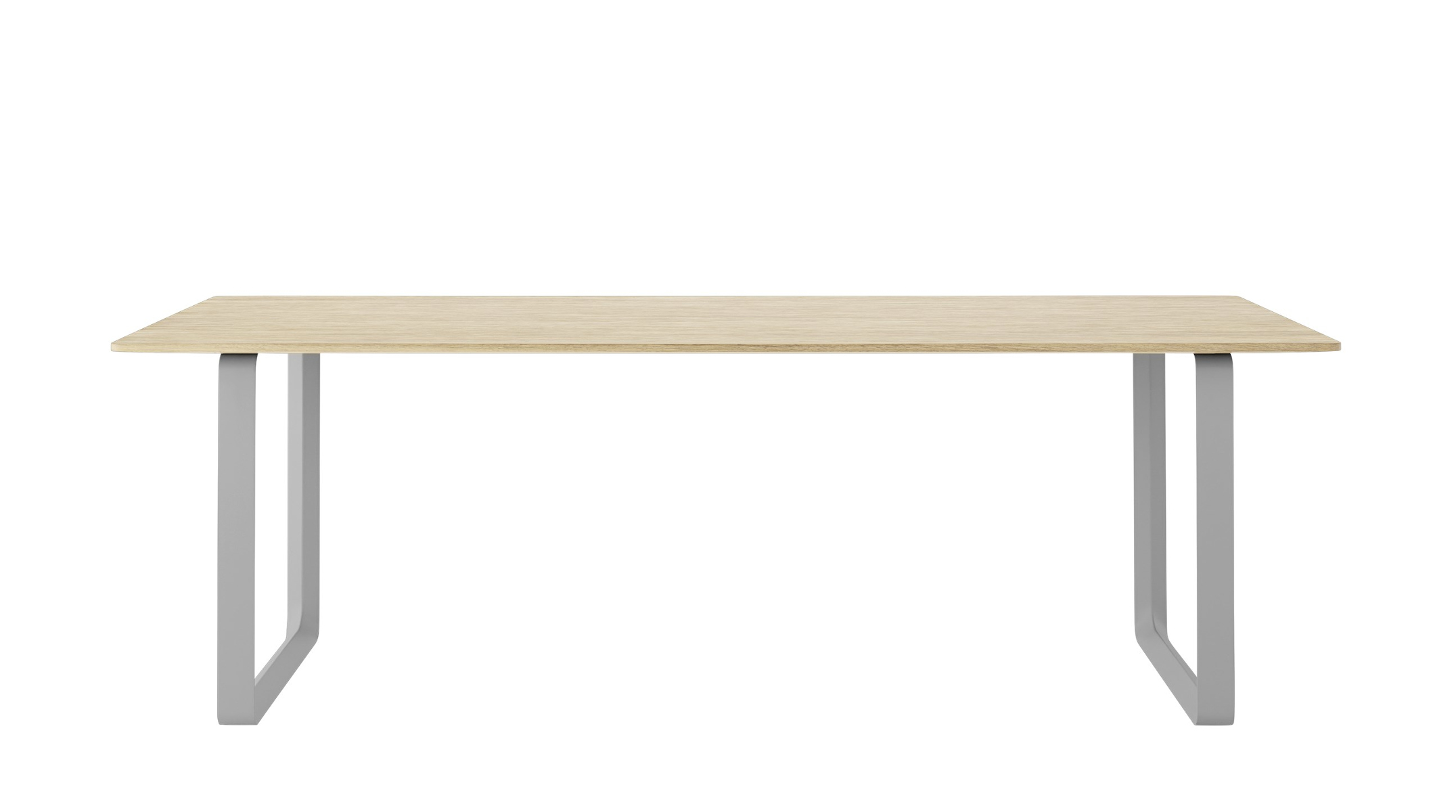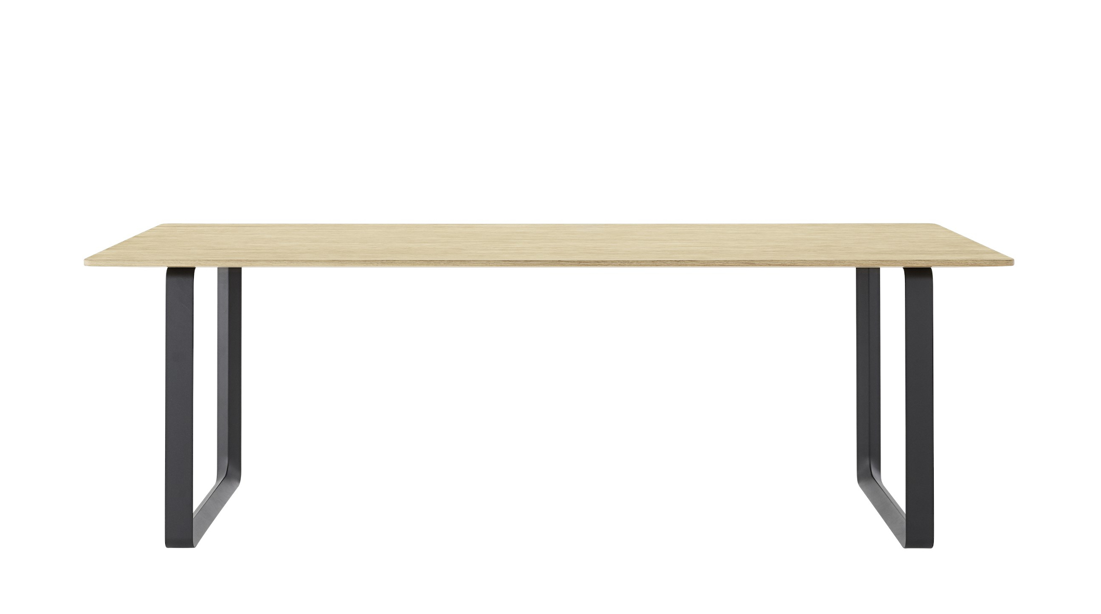 Der von TAF Studio für Muuto entworfene 70/70 Tisch in der Größe 225 x 90 cm kombiniert eine hochwertige Tischplatte aus laminiertem Holz oder Eichenfurnier mit einem pulverbeschichteten Aluminiumgestell. Verschiedene Farbvarianten, darunter Eiche natur, schwarz oder grau, eröffnen individuelle Gestaltungsmöglichkeiten. Die markante Verbindung des Gestells bildet den charakteristischen Mittelpunkt und unterstreicht den minimalistischen Ansatz dieser zeitlosen Kollektion.