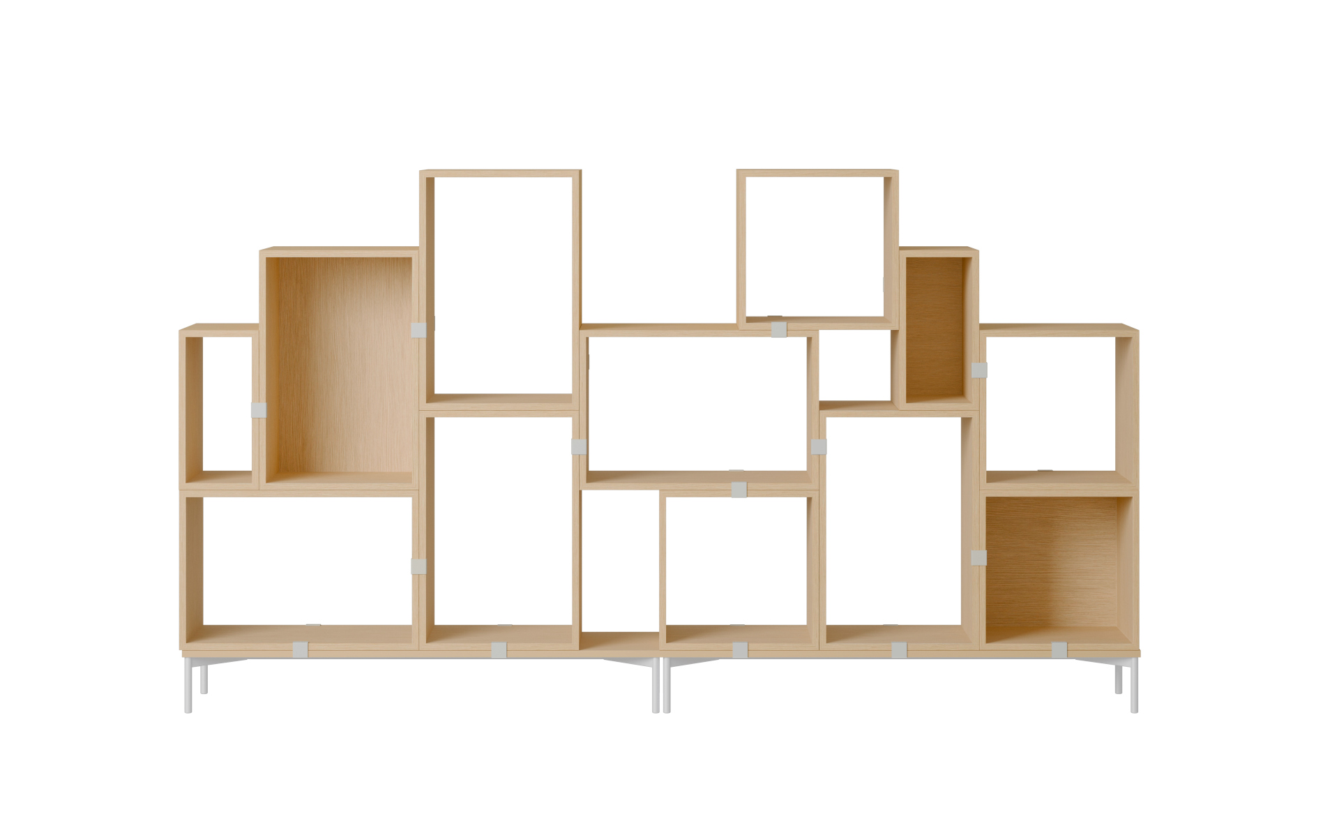 | Material: | Module, Sockel und Einlegeböden aus PU-lackiertem MDF oder eichenfurnierter Faserplatte. Das Podium besteht aus pulverbeschichtetem Stahlrahmen und einer Holzplatte aus PU-lackiertem MDF, oder eichenfurnierter Holzfaserplatte. Die Klammern sind aus pulverbeschichtetem, gebogenem Stahl mit Gummieinlage. Einsatz aus gebogenem, pulverbeschichtetem beschichtetem Stahl mit Gummifüßen. |