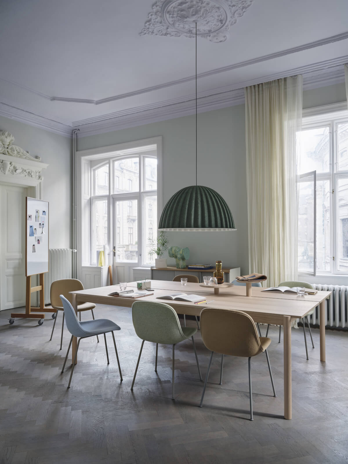 Die Muuto Under The Bell Pendelleuchte verbindet nordisches Design mit innovativer Funktionalität. Mit ihrer charakteristischen, sanft geschwungenen Formgebung schafft sie eine stimmungsvolle Atmosphäre, die Räume neu definiert. Durch ihre akustisch wirksame Oberfläche trägt die Leuchte dazu bei, den Klang im Raum angenehm zu modulieren und bietet so ein außergewöhnliches Licht- und Raumgefühl. Ihr monochromes Design fügt sich harmonisch in unterschiedlichste Interieurs ein, ob in repräsentativen Wohnbereichen, stilvollen Büros oder im modernen Objektbereich. Das weiche, diffuse Licht setzt Akzente und hebt Möbel sowie Architektur subtil hervor. Mit ihrem raffinierten Spiel aus Licht, Schatten und Textur avanciert die Muuto Under The Bell Pendelleuchte Ø 55 cm zum solitären Mittelpunkt anspruchsvoll gestalteter Umgebungen und setzt auf zurückhaltende, zeitlose Eleganz. Die dekorative Pendelleuchte misst 55 cm im Durchmesser und wird aus einem akustisch wirksamen Recycling-Material aus recyceltem PET-Filz gefertigt. Sie ist wahlweise in mehreren gedeckten Farbtönen erhältlich, die sich dezent in verschiedenste Einrichtungskonzepte einfügen. Das Design stammt von dem renommierten Studio Iskos-Berlin, das für seine klaren, intelligenten Entwürfe bekannt ist. Die Muuto Under The Bell Pendelleuchte Ø 55 cm ist mit einer E27-Fassung ausgestattet und kann vielfältig kombiniert oder als Einzelstück inszeniert werden.Under The Bell Pendelleuchte – Vielseitigkeit und nachhaltige Ästhetik