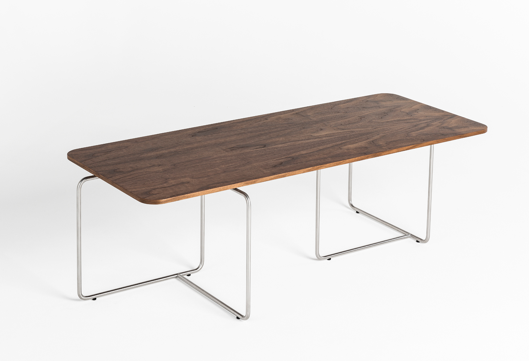 | Material: | Konstruktionselemente: lackierte oder Edelstahlkufen, Tischplatten: MDF-Platten, abgeschlossen mit natürlichem Furnier |