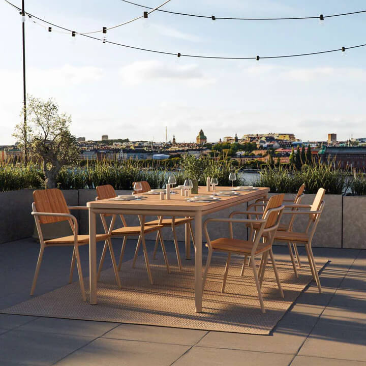 | Material: | Pulverbeschichtetes Aluminium, FSC®-zertifiziertes Teakholz – langlebig, wetterfest und pflegeleicht. Aluminium ist rostfrei, Teakholz entwickelt mit der Zeit eine schöne, natürliche Patina. |