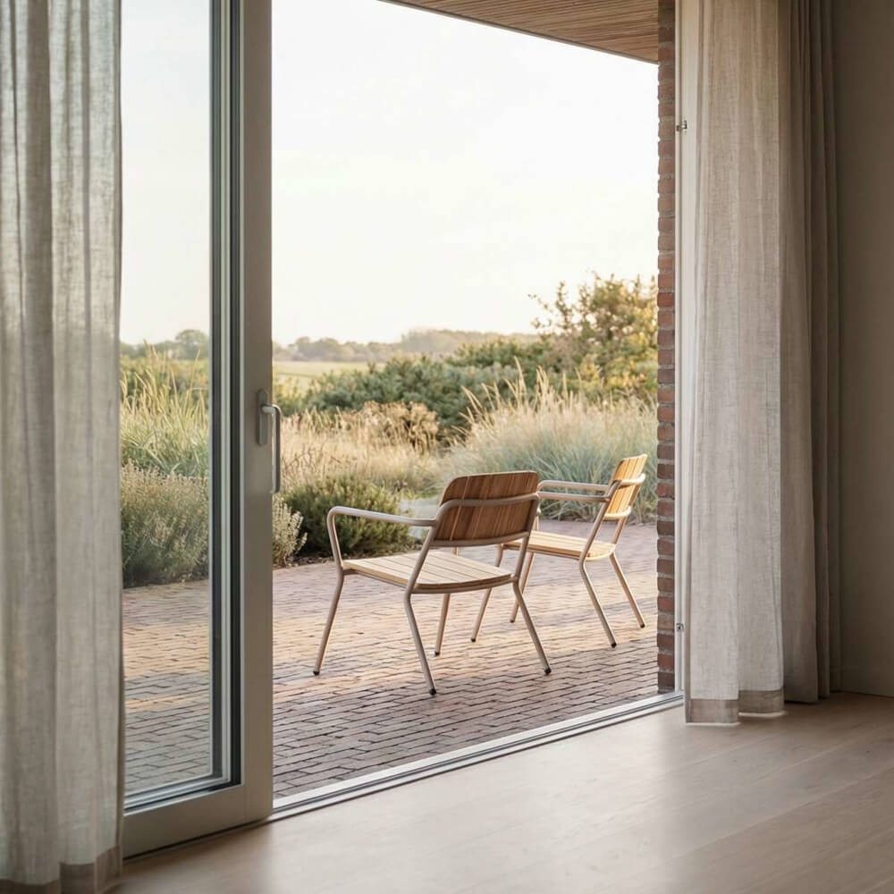 | Material: | Pulverbeschichtetes Aluminium, FSC®-zertifiziertes Teakholz – langlebig, wetterfest und pflegeleicht. Aluminium ist rostfrei, Teakholz entwickelt mit der Zeit eine schöne, natürliche Patina. |