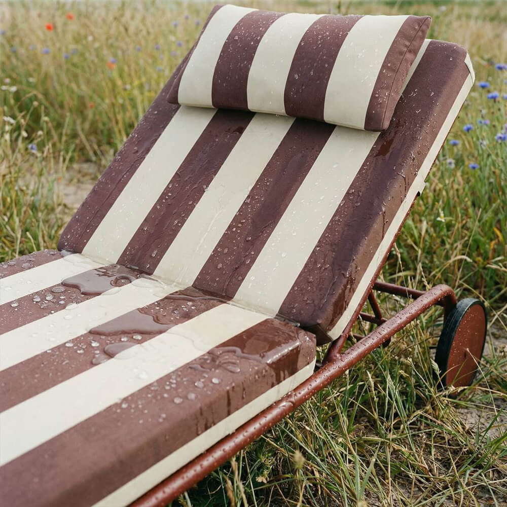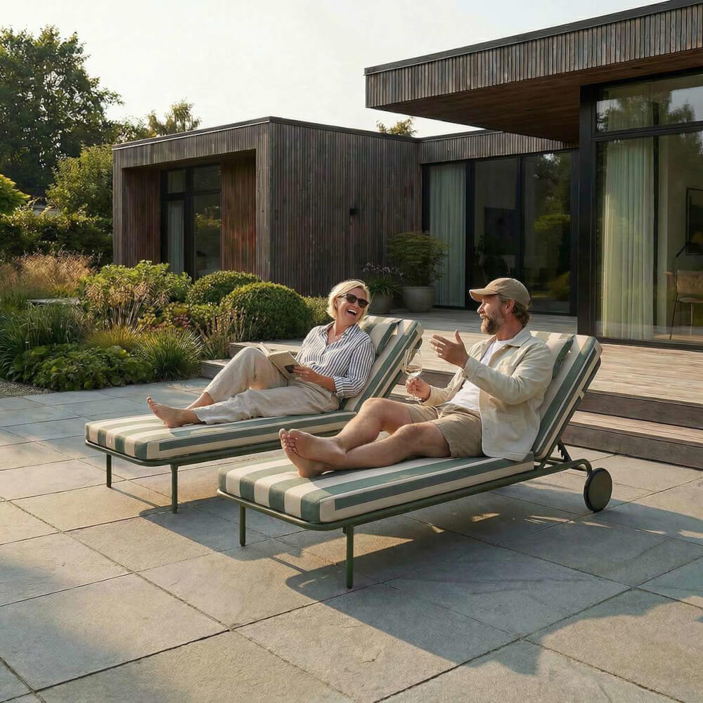 | Material: | Gestell aus pulverbeschichtetem Aluminium – leicht, stabil und wetterbeständig. Polsterfüllung aus upgecyceltem Kaltschaum in wasserdichten Polyesterhüllen – formstabil, schnell trocknend und ideal für den Outdoor-Einsatz. |
