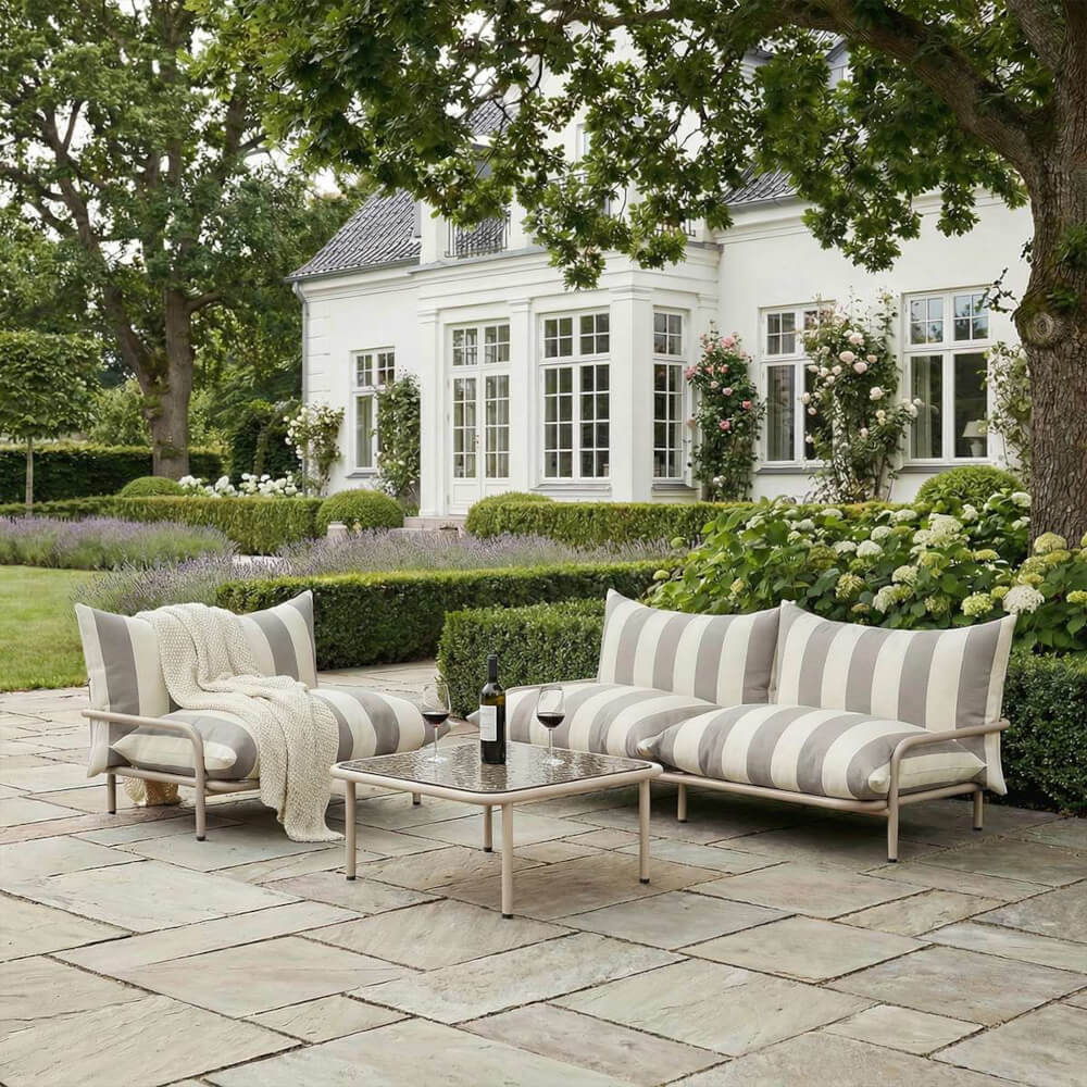 | Material: | Gestell aus pulverbeschichtetem Aluminium – leicht, stabil und wetterbeständig. Polsterfüllung aus upgecyceltem Kaltschaum in wasserdichten Polyesterhüllen – formstabil, schnell trocknend und ideal für den Outdoor-Einsatz. |