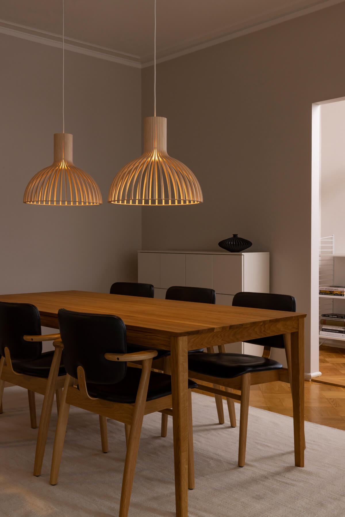 Gefertigt wird die Secto Design Victo 4251 Pendelleuchte nach Entwürfen der Designerin Seppo Koho. Die Leuchte misst 48 Zentimeter in der Höhe und 56 Zentimeter im Durchmesser. Sie wird aus nachhaltigem, formgepresstem Birkenholz hergestellt und ist in vier edlen Farbvarianten erhältlich: Natur, Walnuss, Schwarz oder Weiß lackiert. Das schwarze oder weiße Kabel sowie die dezente Baldachin-Ausführung akzentuieren die skandinavische Ästhetik und unterstreichen die hohe Qualität der Leuchte.