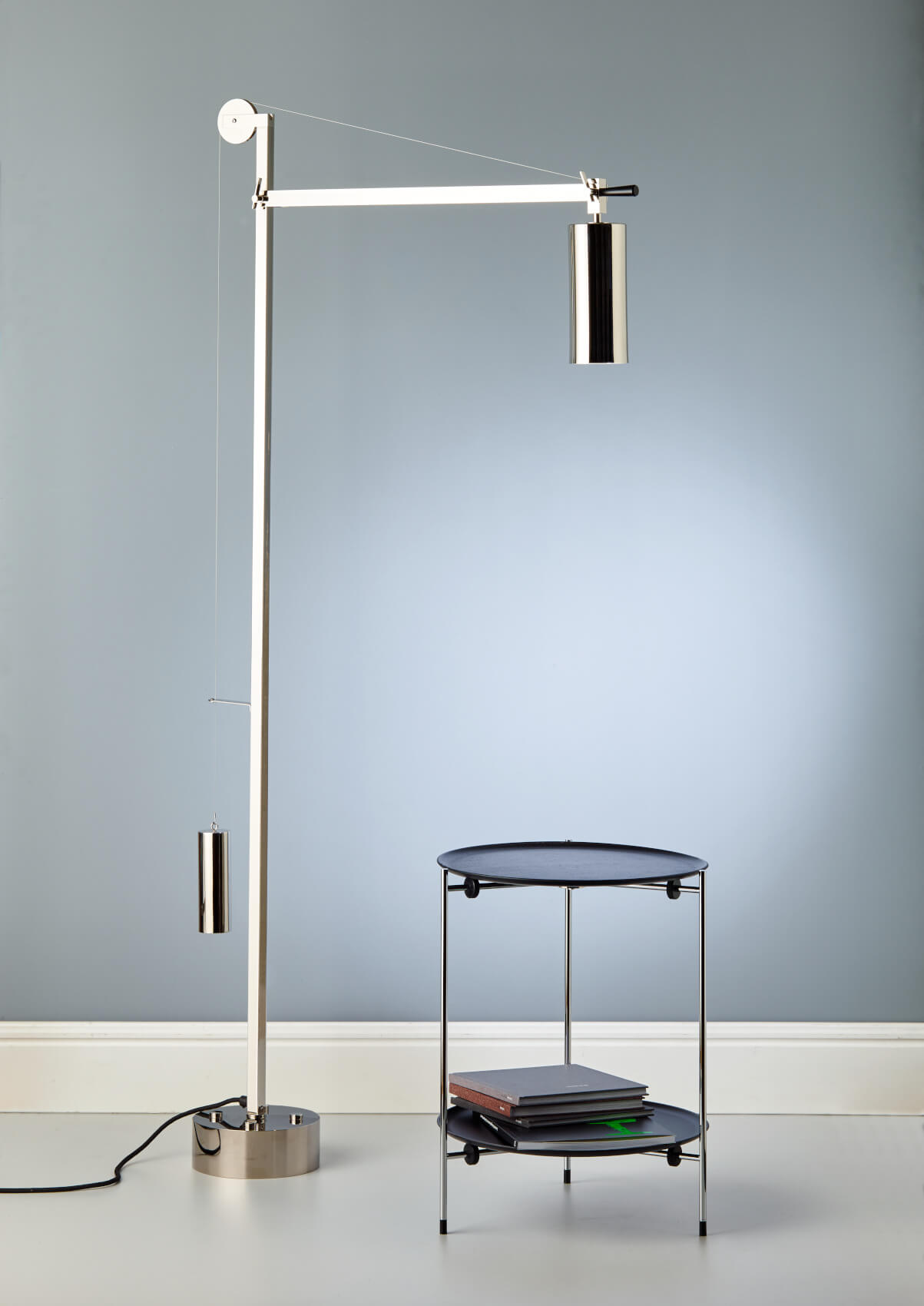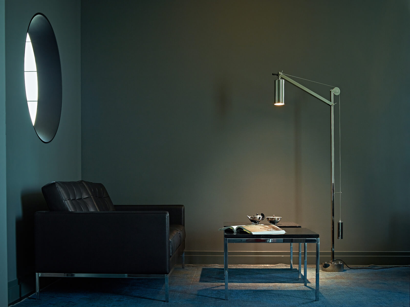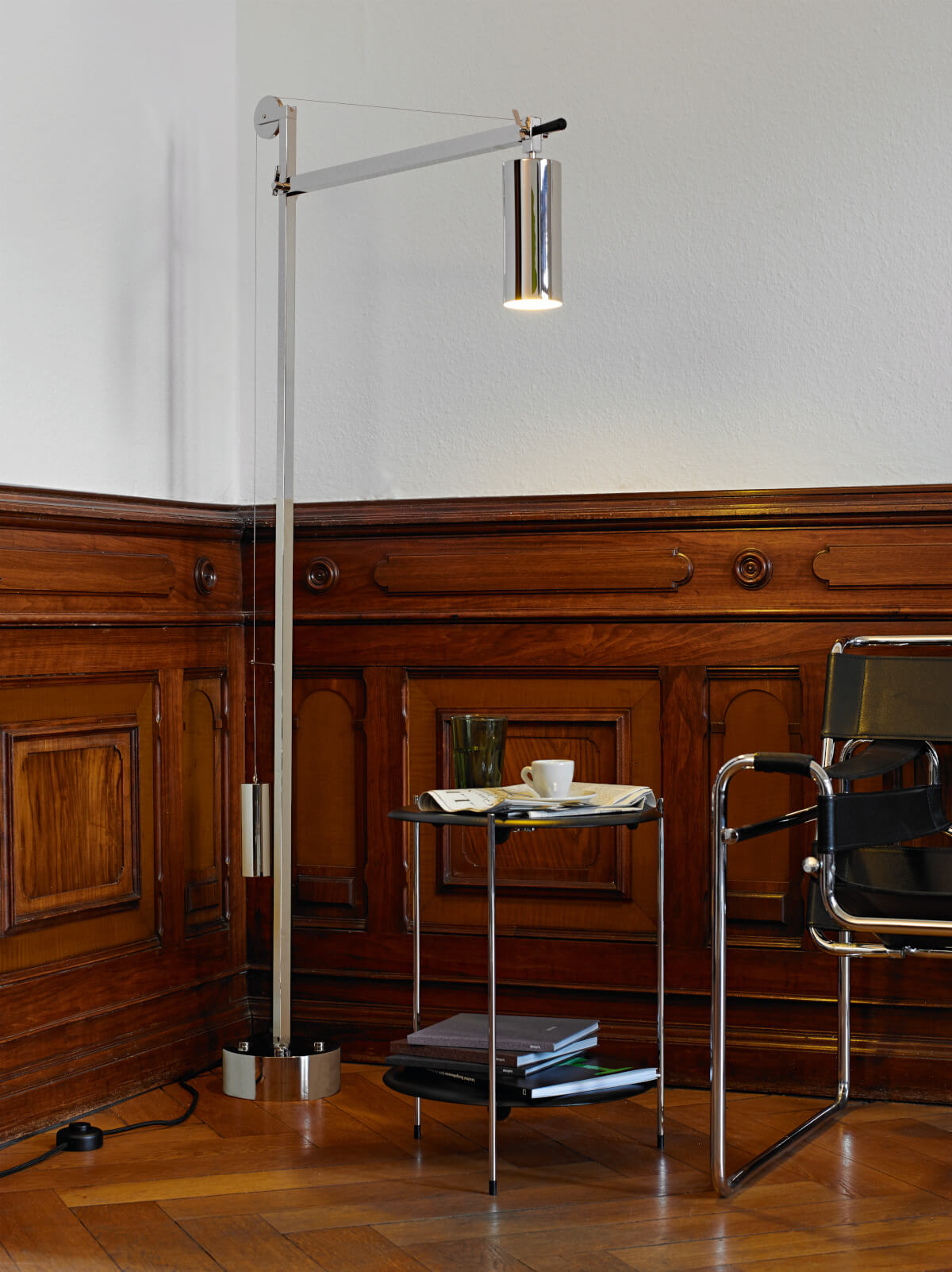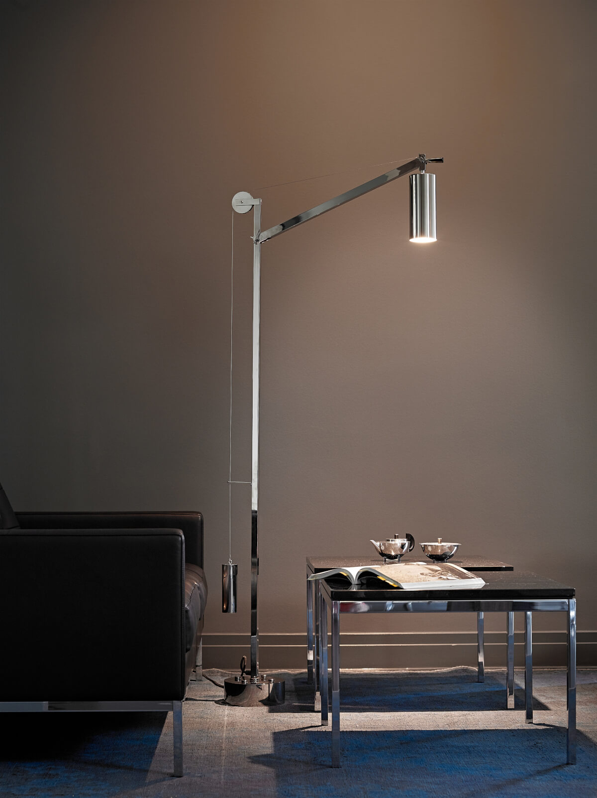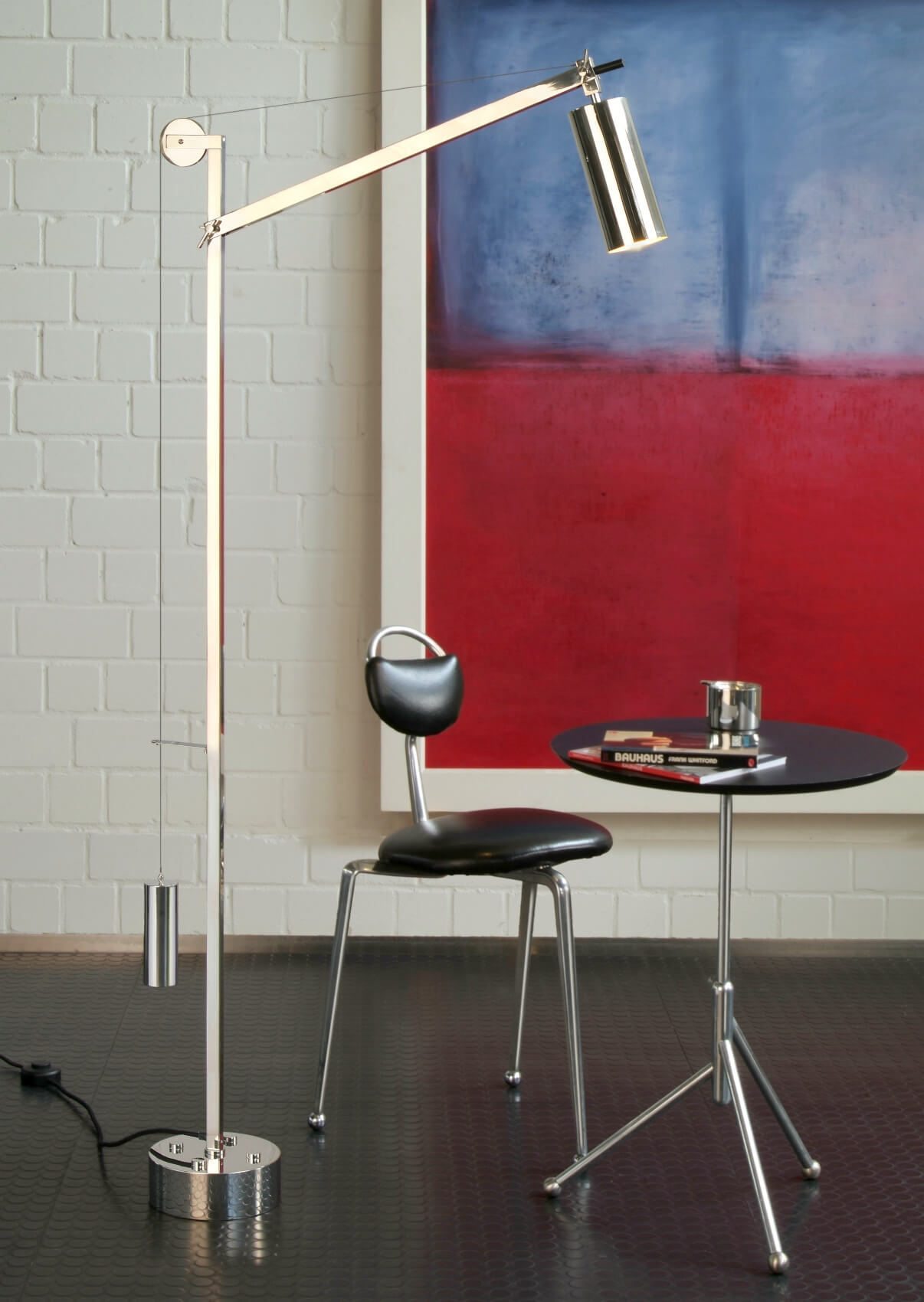 In gerader Linie von 161 cm ragt die BH 23 Stehleuchte in die Höhe. Der auslegende Arm hält in 76 cm über eine Umlenkrolle die vernickelte Metallhülse mit dem Leuchtmittel. Das Gegengewicht setzt nicht nur optisch das entscheidende Ausrufezeichen, vielmehr sichert es im harmonischen Zusammenspiel mit dem runden Fuß den festen Stand beim Neigen und Heben des Auslegers.Tecnolumen Designer Stehleuchte: Akzente setzen im Bauhausstil