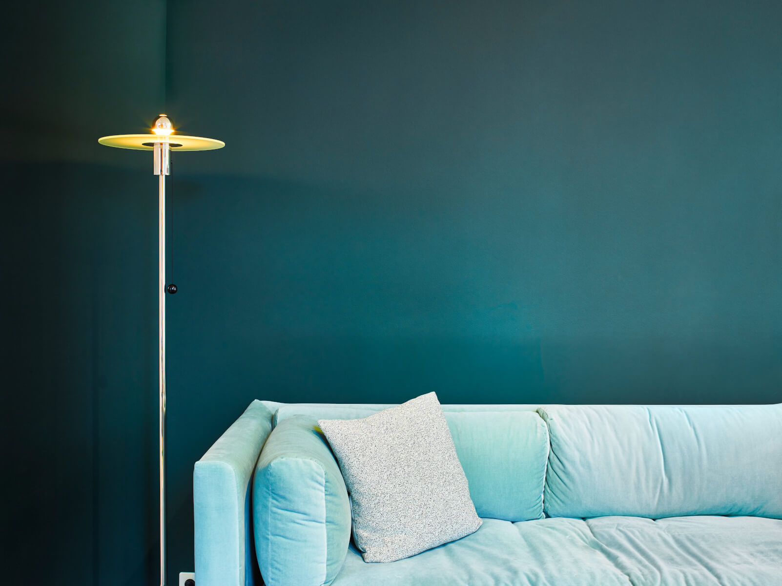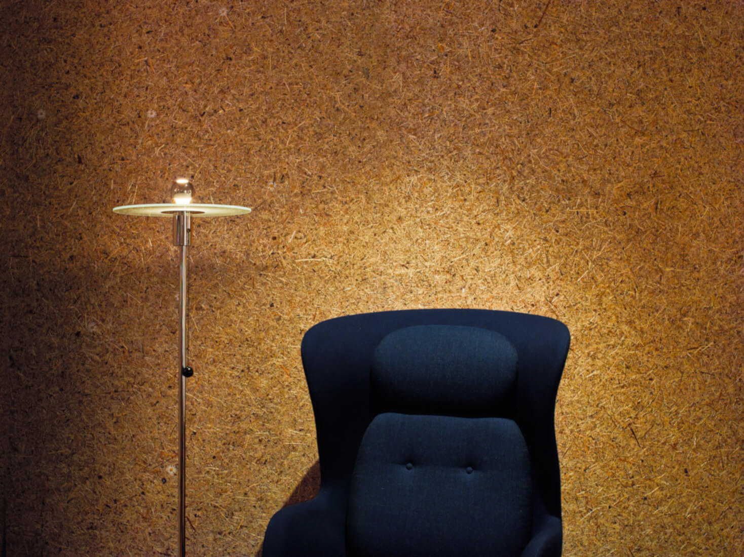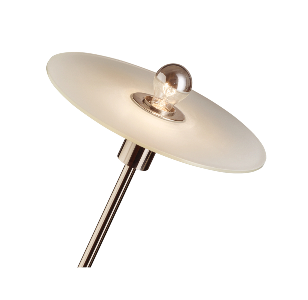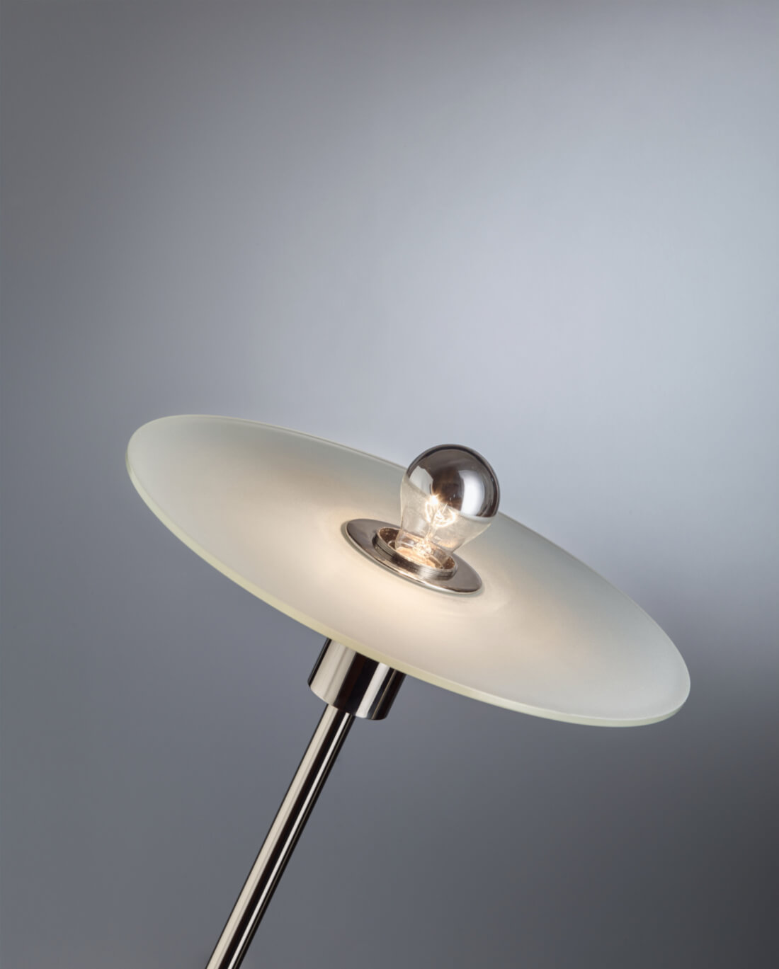 Der Blick wird gelenkt auf die kuppenverspiegelte Glühlampe, deren Licht die waagerecht mattgeätzte Glasscheibe aufnimmt und den gebrochenen Schein optisch schweben lässt.