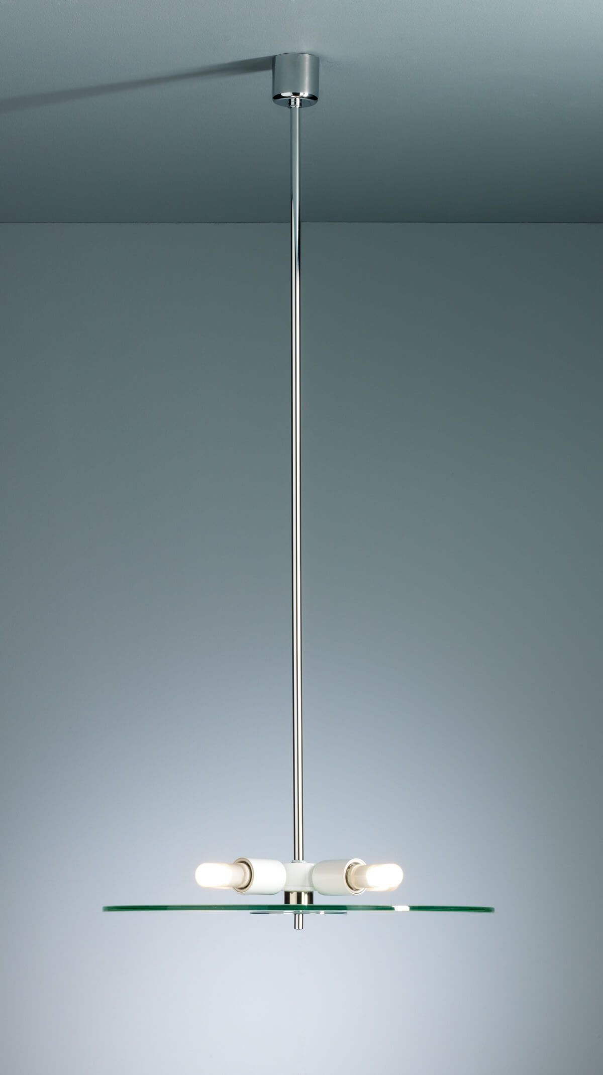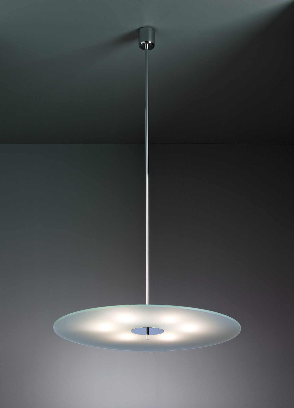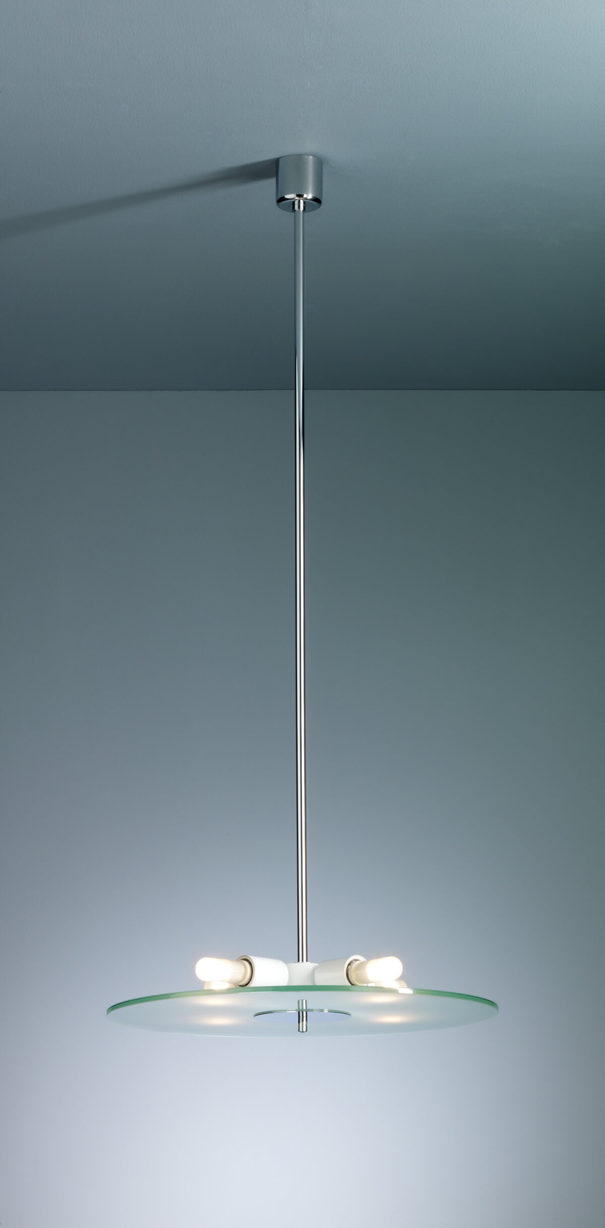 Eine flache, mattierte, dicke Glasscheibe, zentrisch gehalten, bestimmt die Form dieser einfachen Pendelleuchte. Sie ist besonders gut geeignet als Allgemeinbeleuchtung in hohen Räumen. Das klare Design wird dominiert von der matten Glasscheibe. Darüber liegen frei vier Leuchtmittel in E 27 Hülsen. Die Stromleitung wird durch den mattverchromten Metallstab geführt.