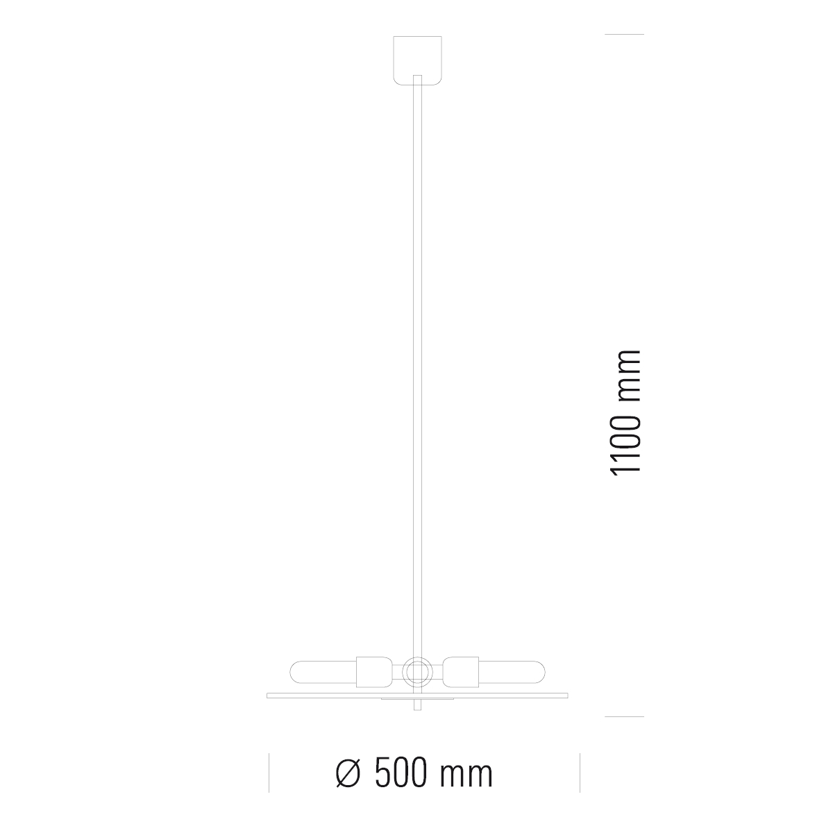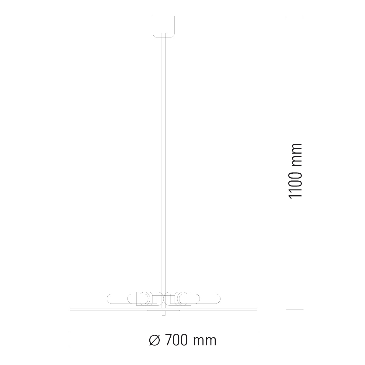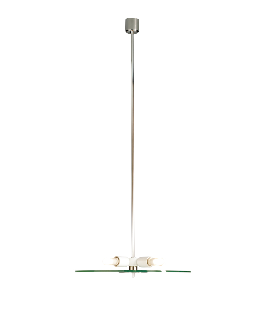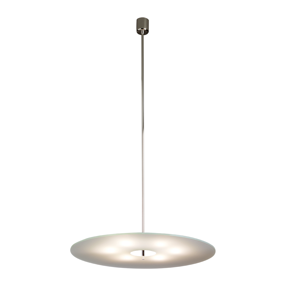 Eine flache, mattierte, dicke Glasscheibe, zentrisch gehalten, bestimmt die Form dieser einfachen Pendelleuchte. Sie ist besonders gut geeignet als Allgemeinbeleuchtung in hohen Räumen. Das klare Design wird dominiert von der matten Glasscheibe. Darüber liegen frei vier Leuchtmittel in E 27 Hülsen. Die Stromleitung wird durch den mattverchromten Metallstab geführt.