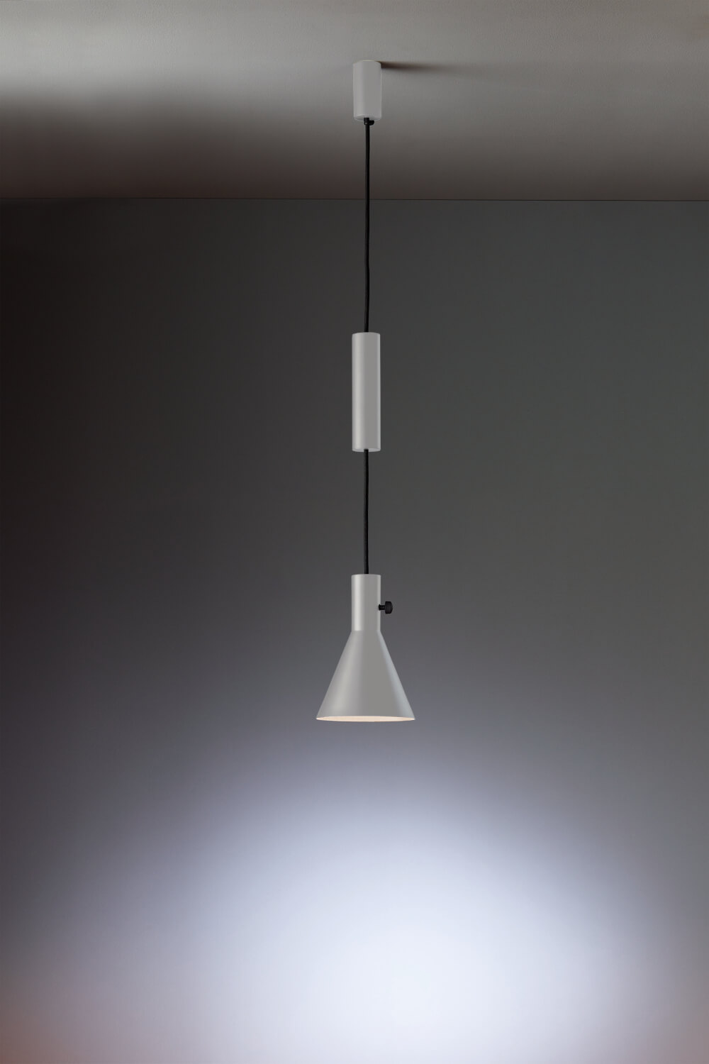 Die Aufhängung ist entgegen handelsüblicher Pendelleuchten länglich. Passend zur Stehleuchte ES 57 ähneln die Attribute. Schnurgerade birgt die Aufhängung das Kabel und mündet direkt in das Leuchtmittel, das der Lampenschirm umhüllt.