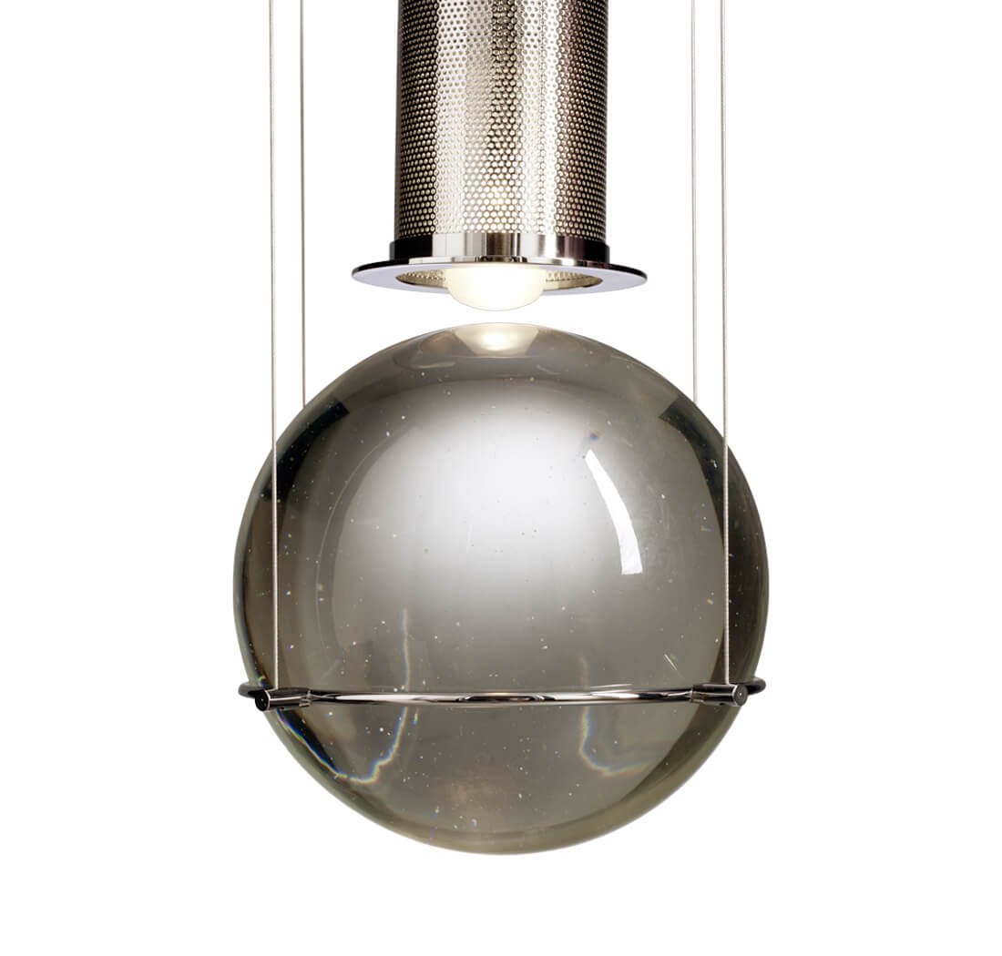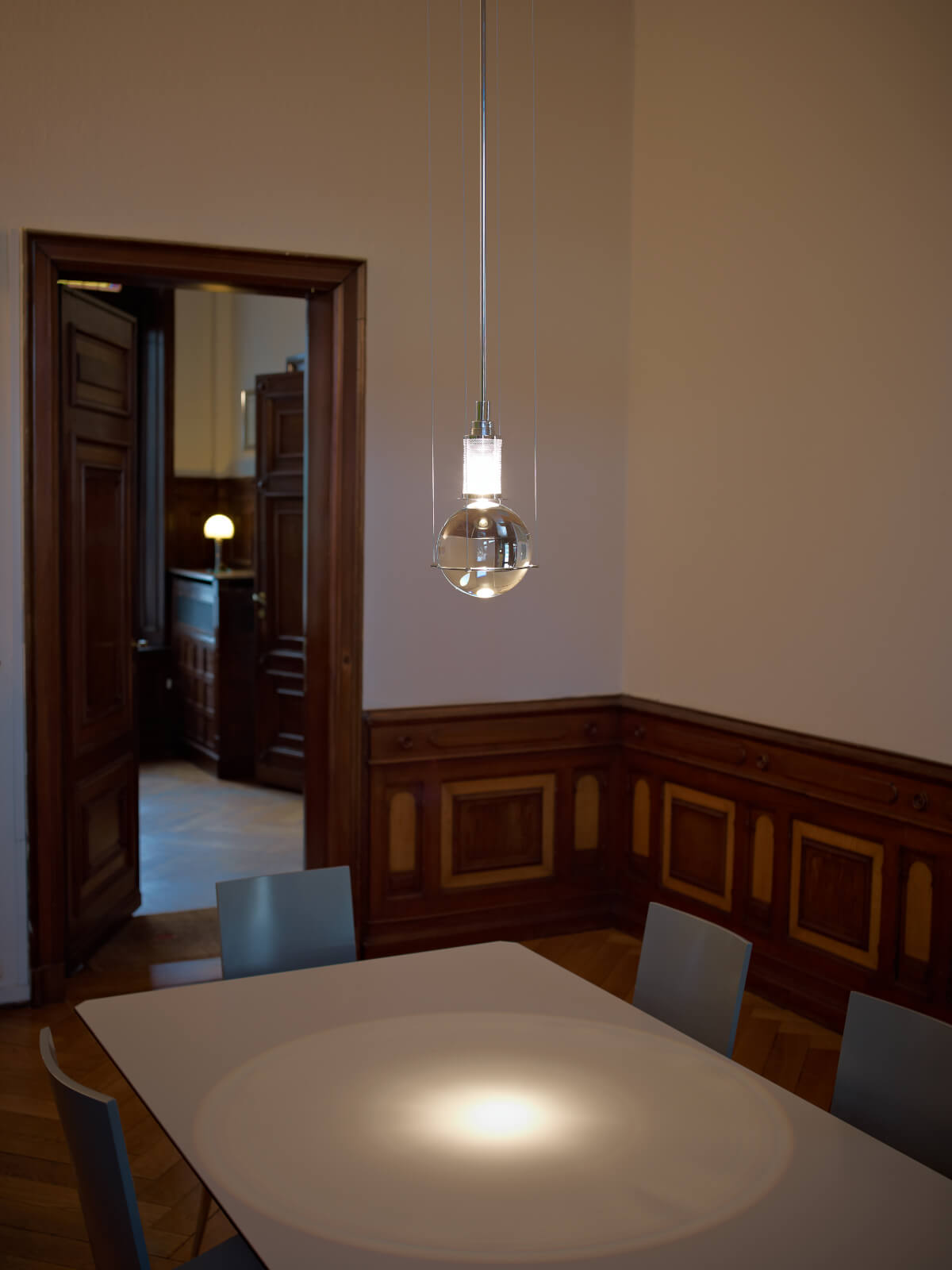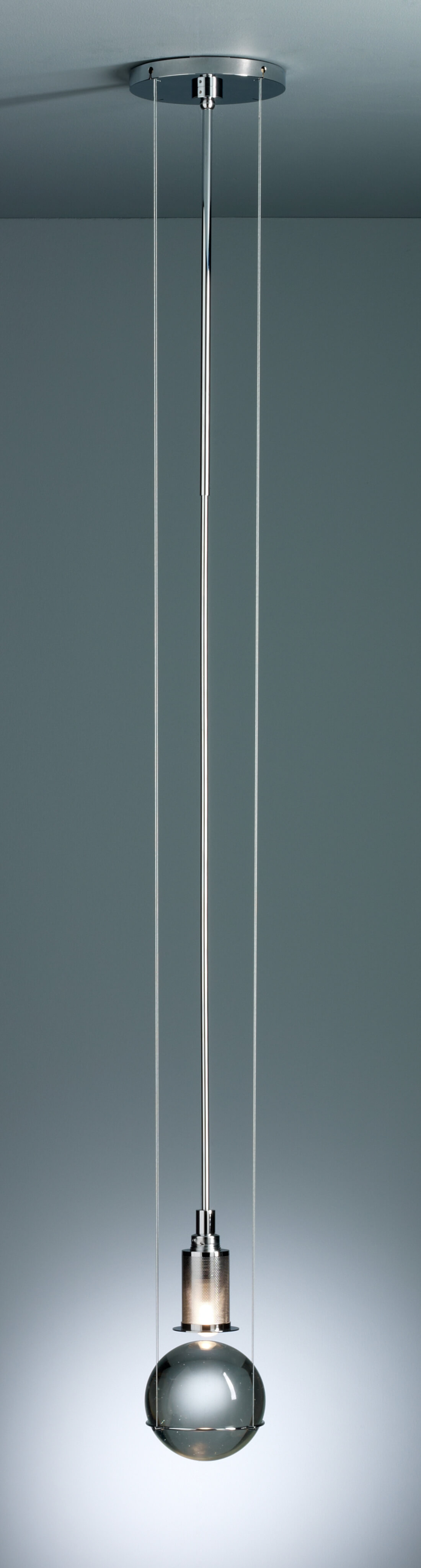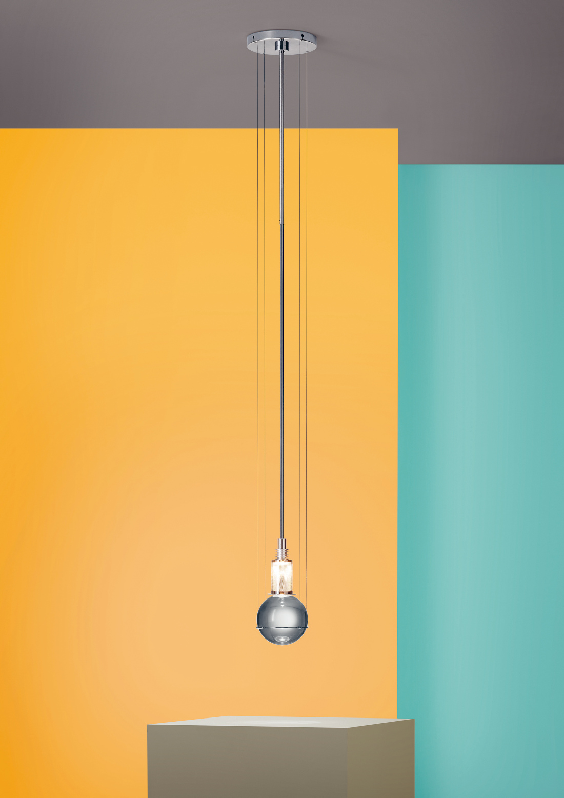 | Details: | 1981 wurde diese Hängeleuchte von Günter Leuchtmann eigens für das Restaurant namens „Le tre streghe” („Die drei Hexen”) in Hamburg entworfen. Eine aus Muranoglas handgefertigte Glaskugel wird von oben aus einem Metallsieb-Zylinder angestrahlt. |