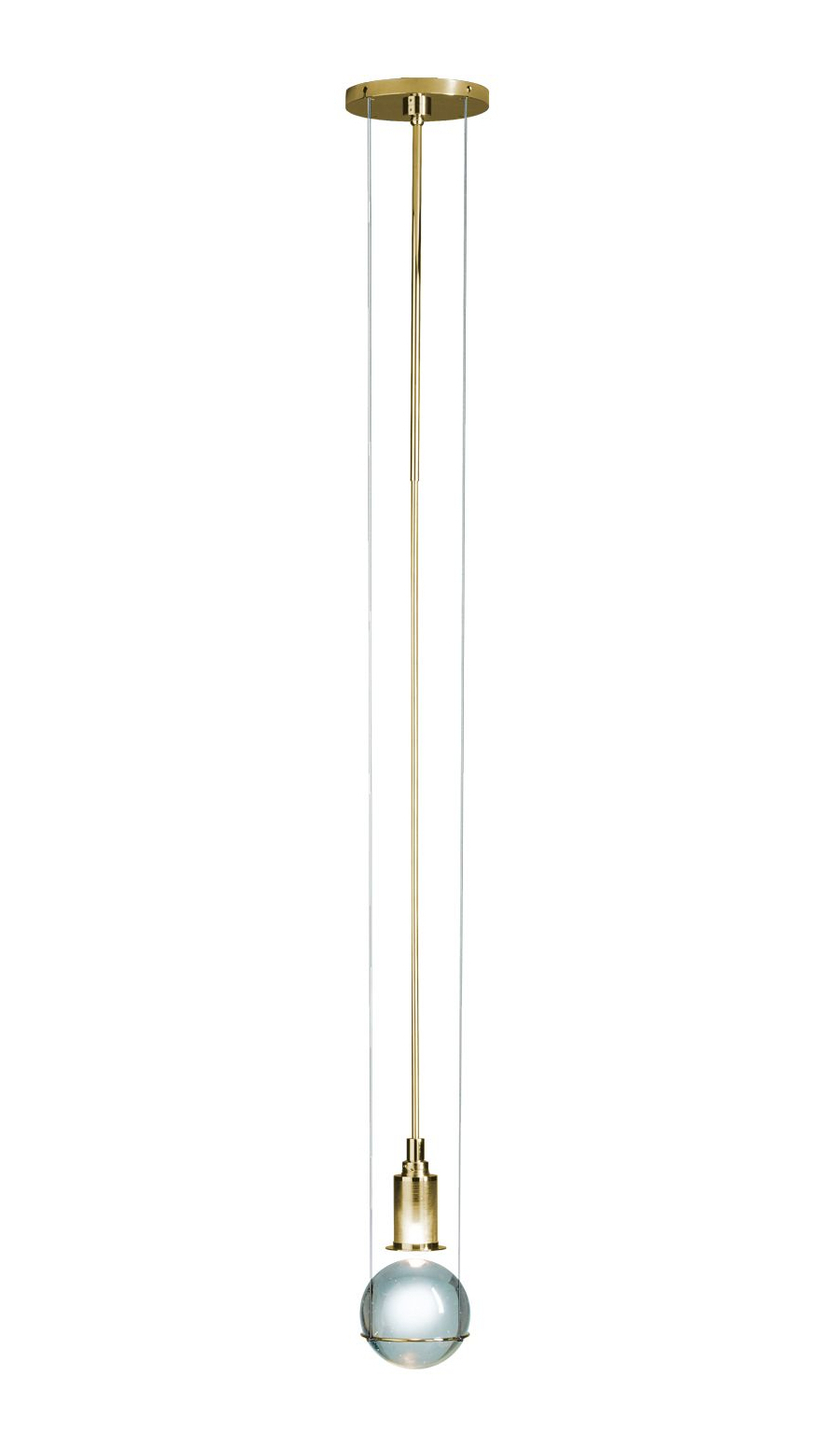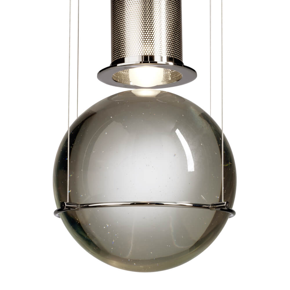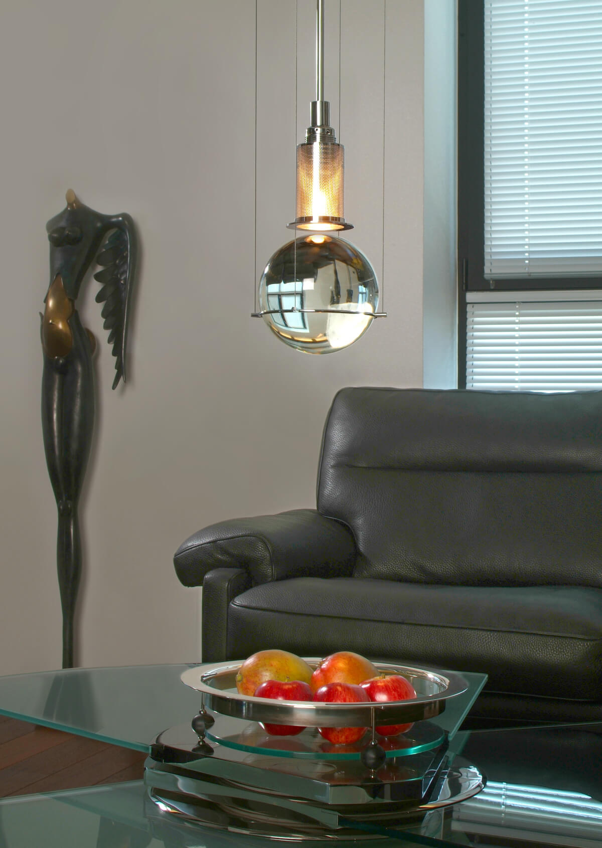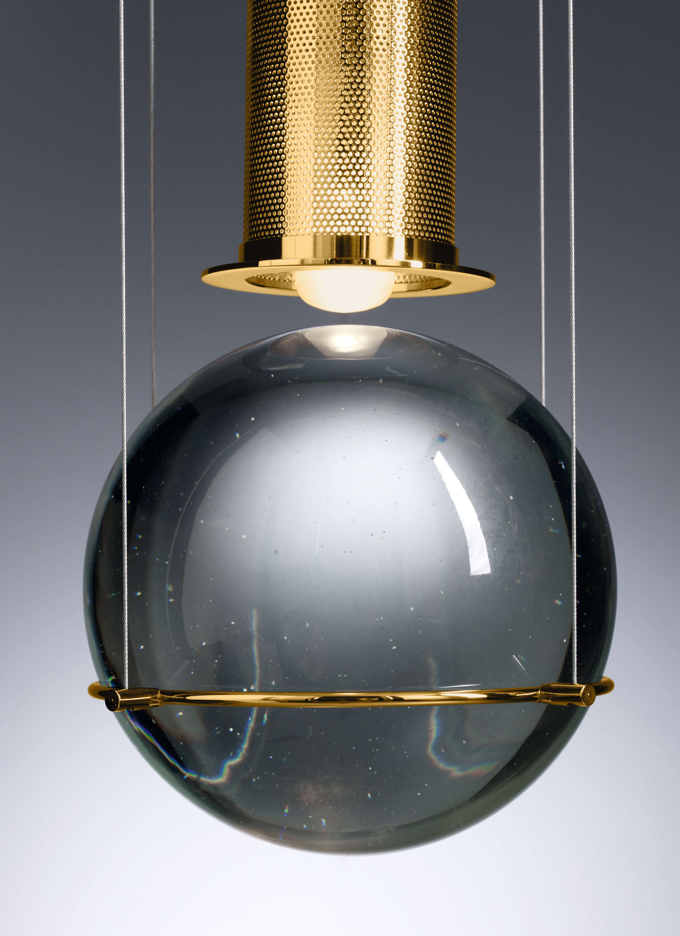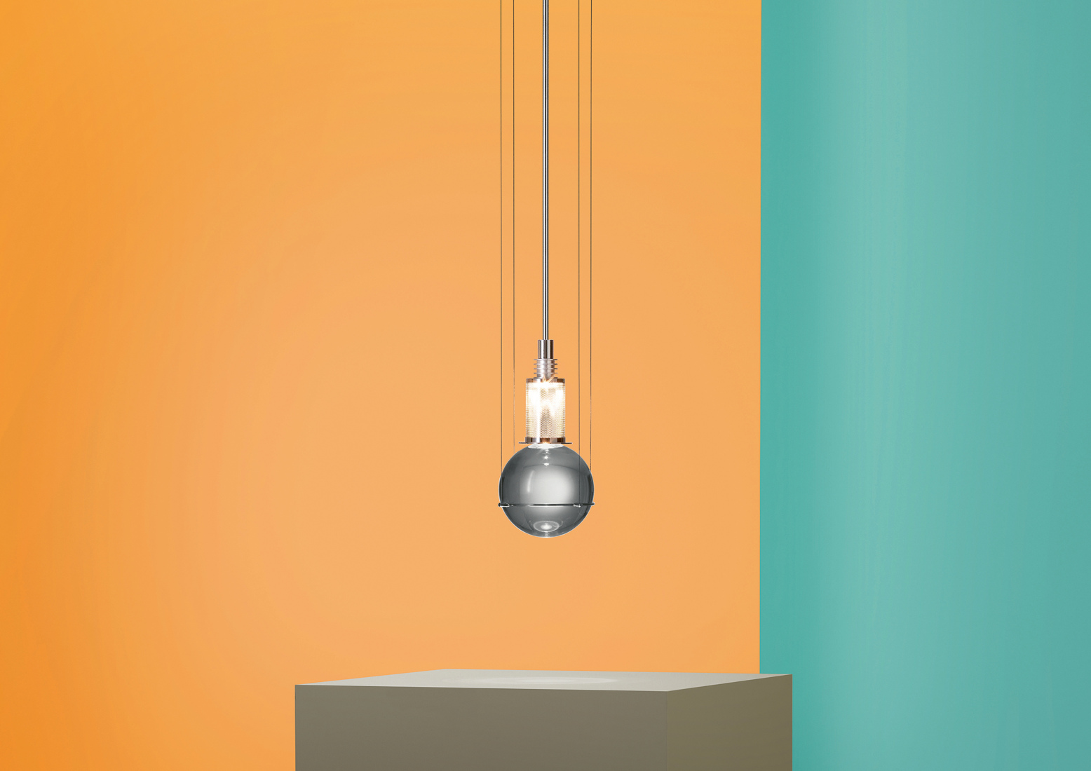 | Details: | 1981 wurde diese Hängeleuchte von Günter Leuchtmann eigens für das Restaurant namens „Le tre streghe” („Die drei Hexen”) in Hamburg entworfen. Eine aus Muranoglas handgefertigte Glaskugel wird von oben aus einem Metallsieb-Zylinder angestrahlt. |