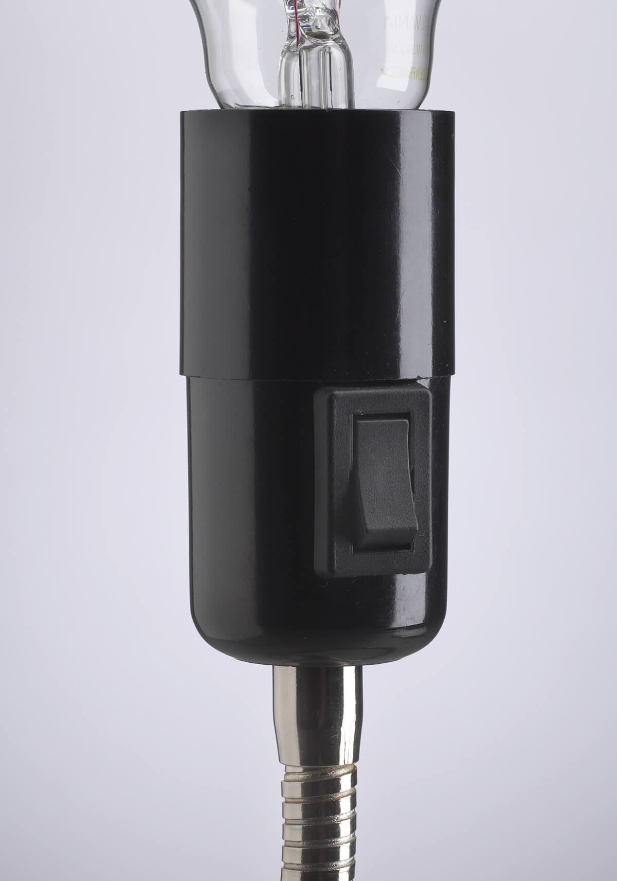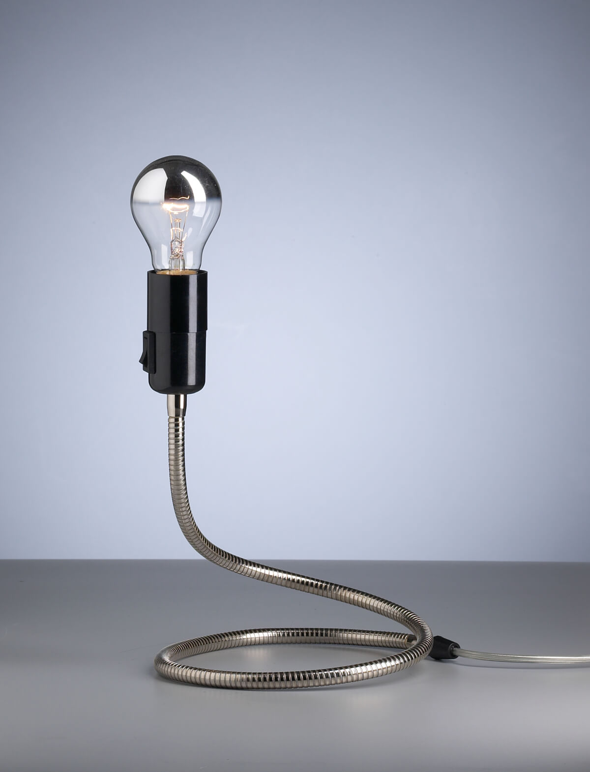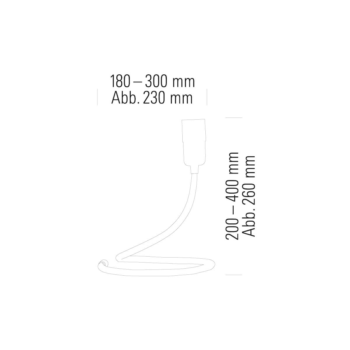 | Details: | Die Besonderheit dieser Leuchte ist seine Flexibilität. Ihr Fuß besteht aus flexiblen Metallgliedern, den Kopf bildet eine kopfverspiegelte Glühlampe. An der schwarzen Kunststofffassung befindet sich der Kippschalter., verstellbare Höhe: 20 - 40 cm, verstellbare Breite: 18 - 30 cm, Kippschalter an der Fassung |