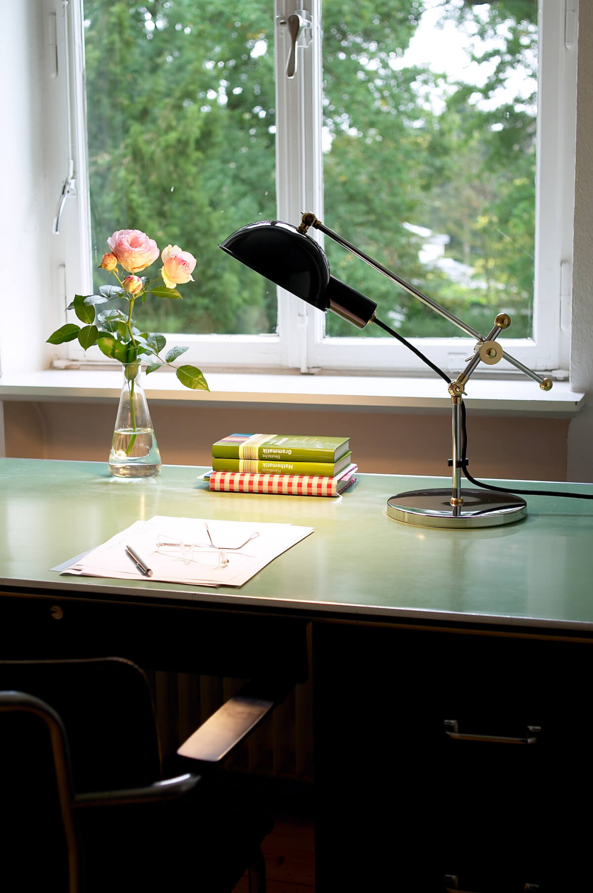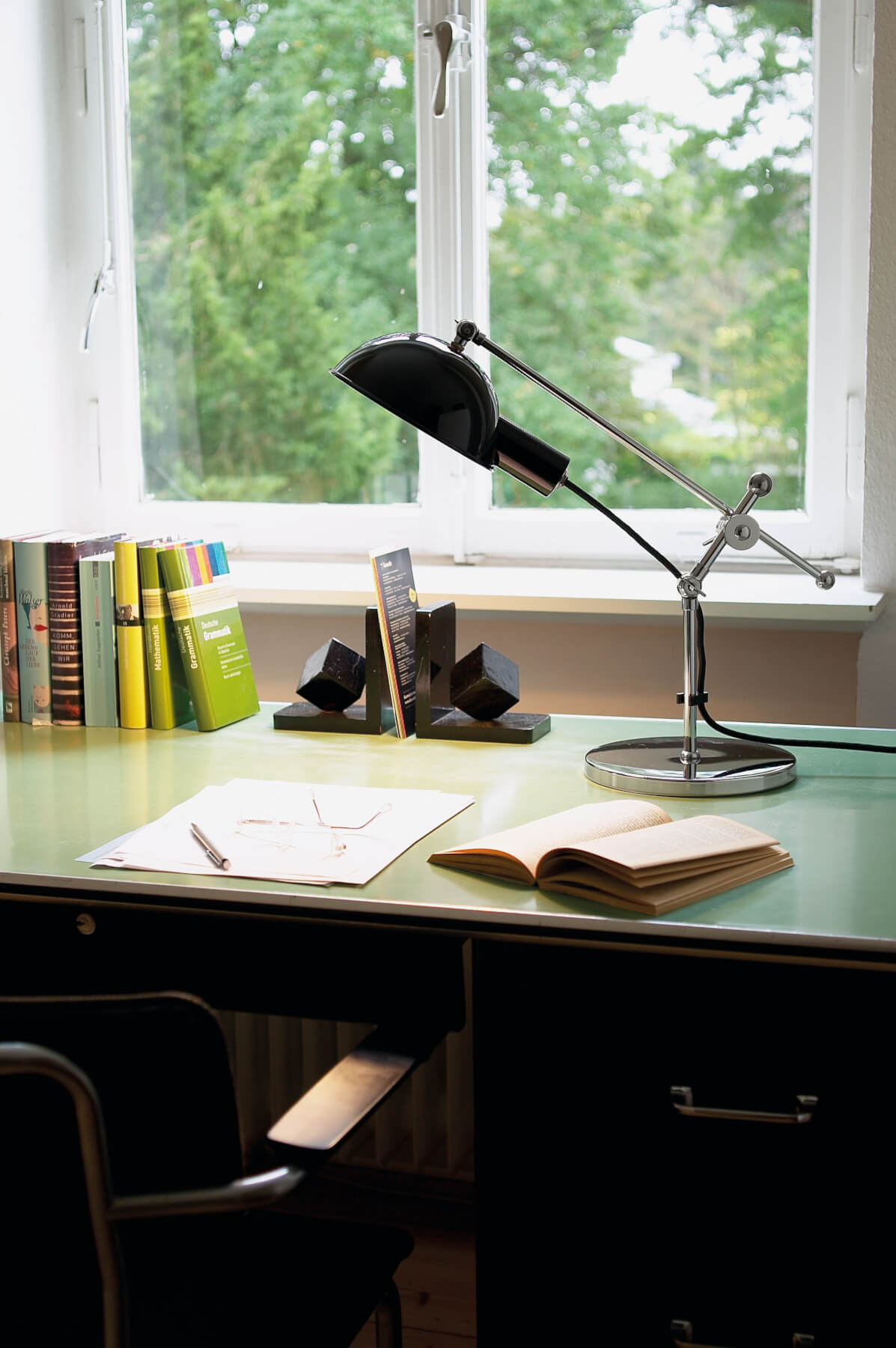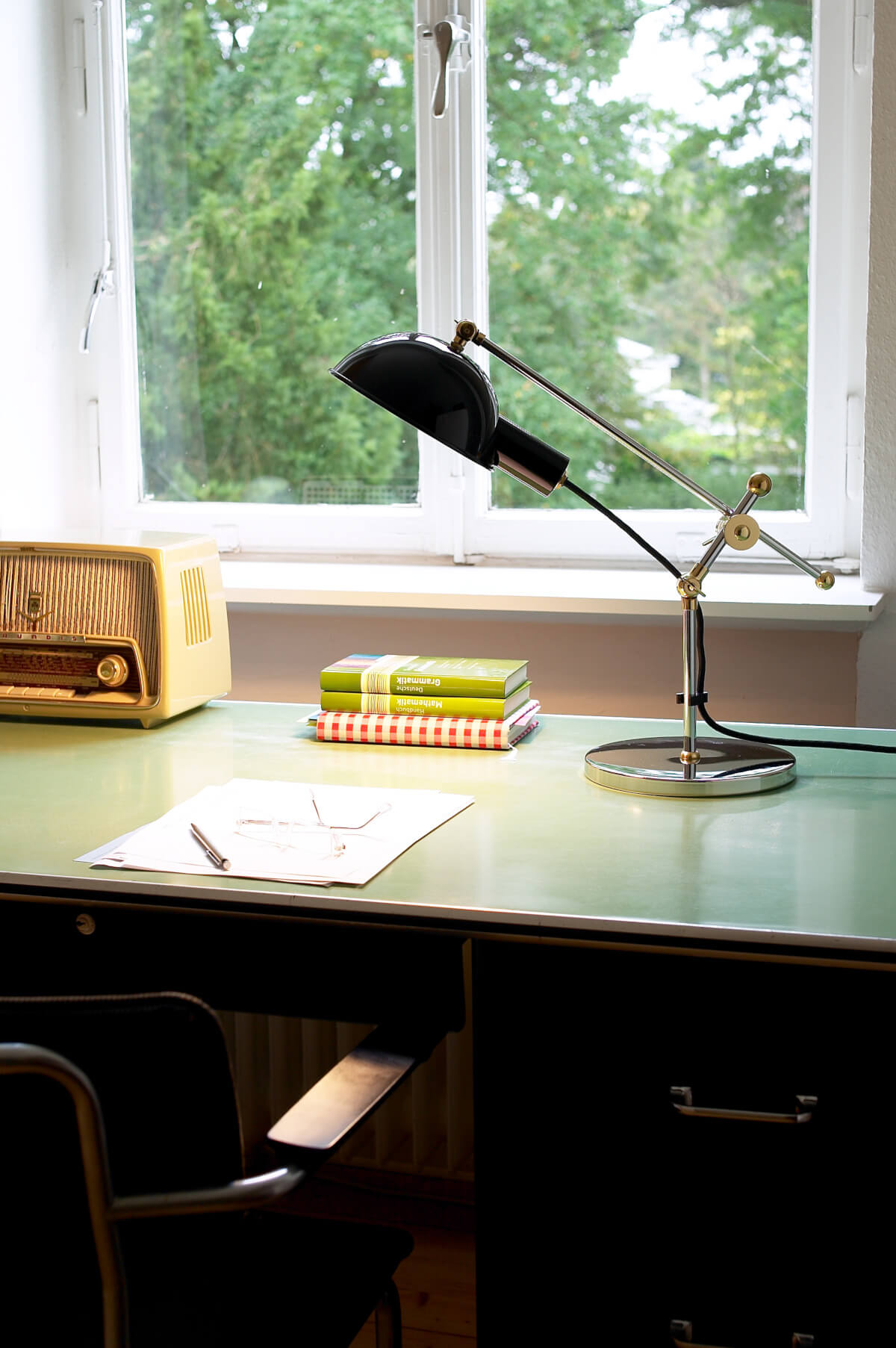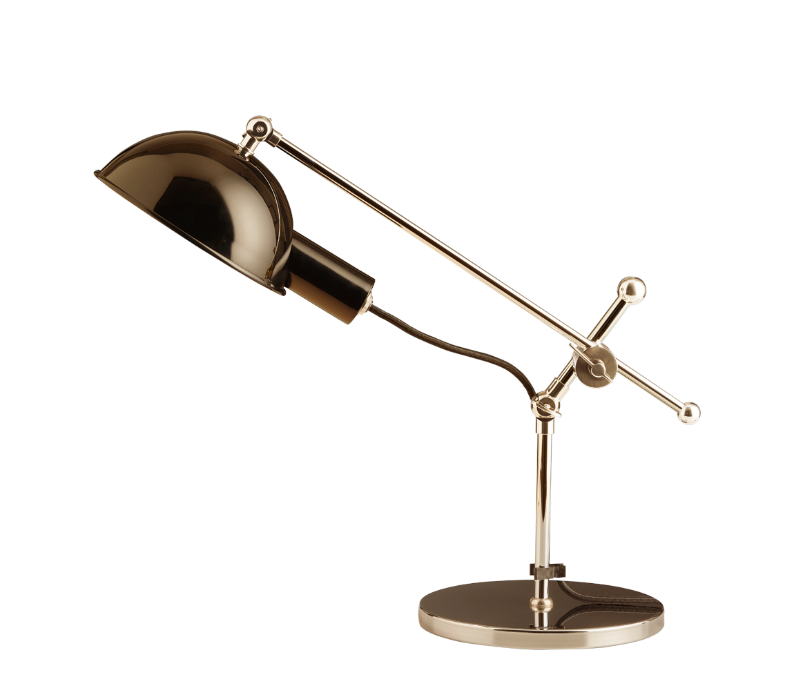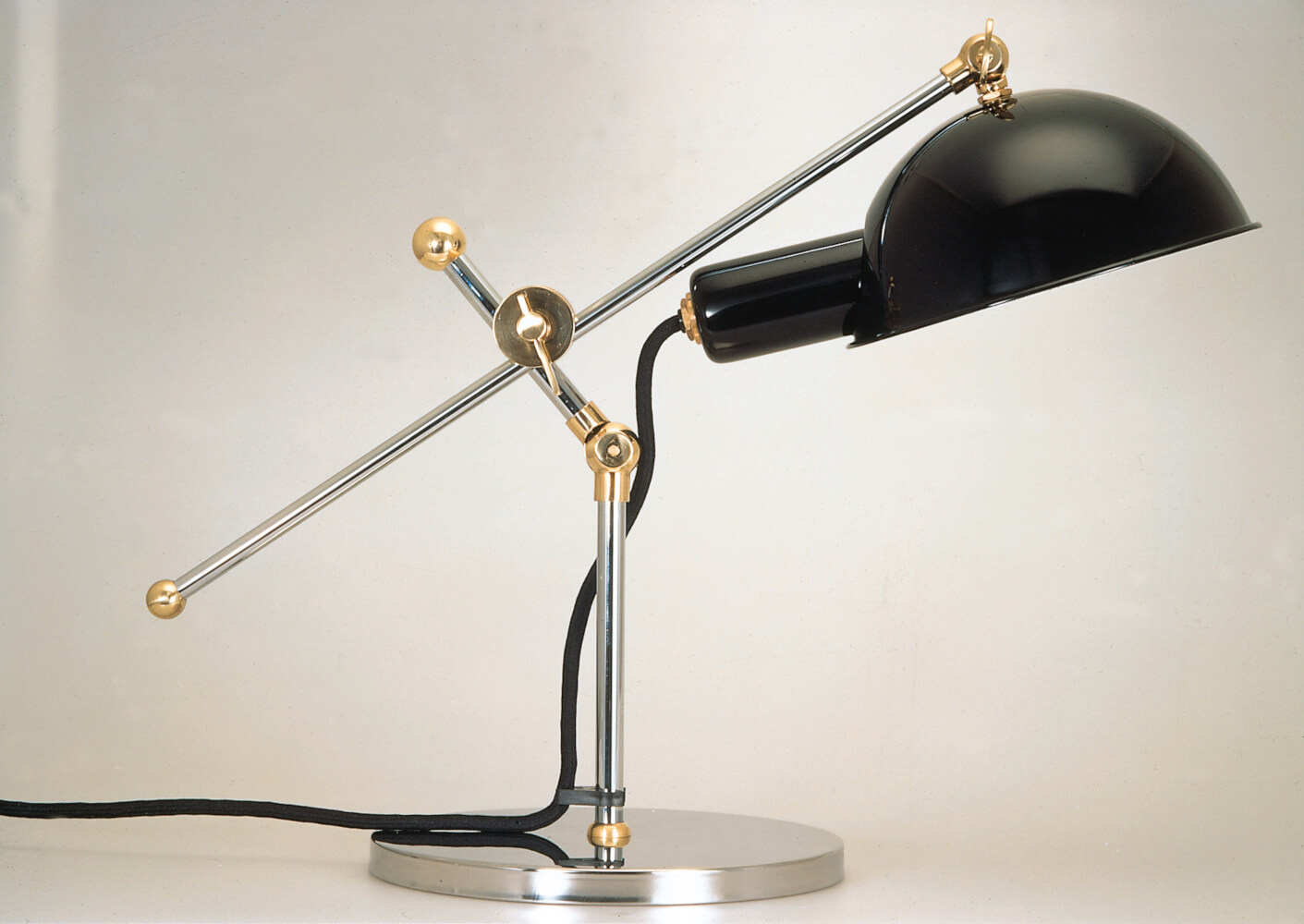 | Details: | Hergestellt werden die Leuchten von den Unternehmen THONET und TECNOLUMEN, die hierzu eine Kooperation gebildet haben und die Leuchten unter dem Signet „THONET by TECNOLUMEN”, In den späten 20er Jahren gab es eine Reihe sich ähnelnder Schreibtischleuchten, denen gemeinsam war, an verschiedenen Funktionspunkten verschiebbar oder drehbar zu sein. Designer wie Christian Dell, Ferdinand Kramer, Marianne Brandt und Eduard-Wilfrid Buquet schufen Modelle verschiedenster Art. Das Original zu unserer Leuchte fanden wir in Schweden, allerdings war es nicht möglich festzustellen, wie die Oberfläche beschaffen war. |