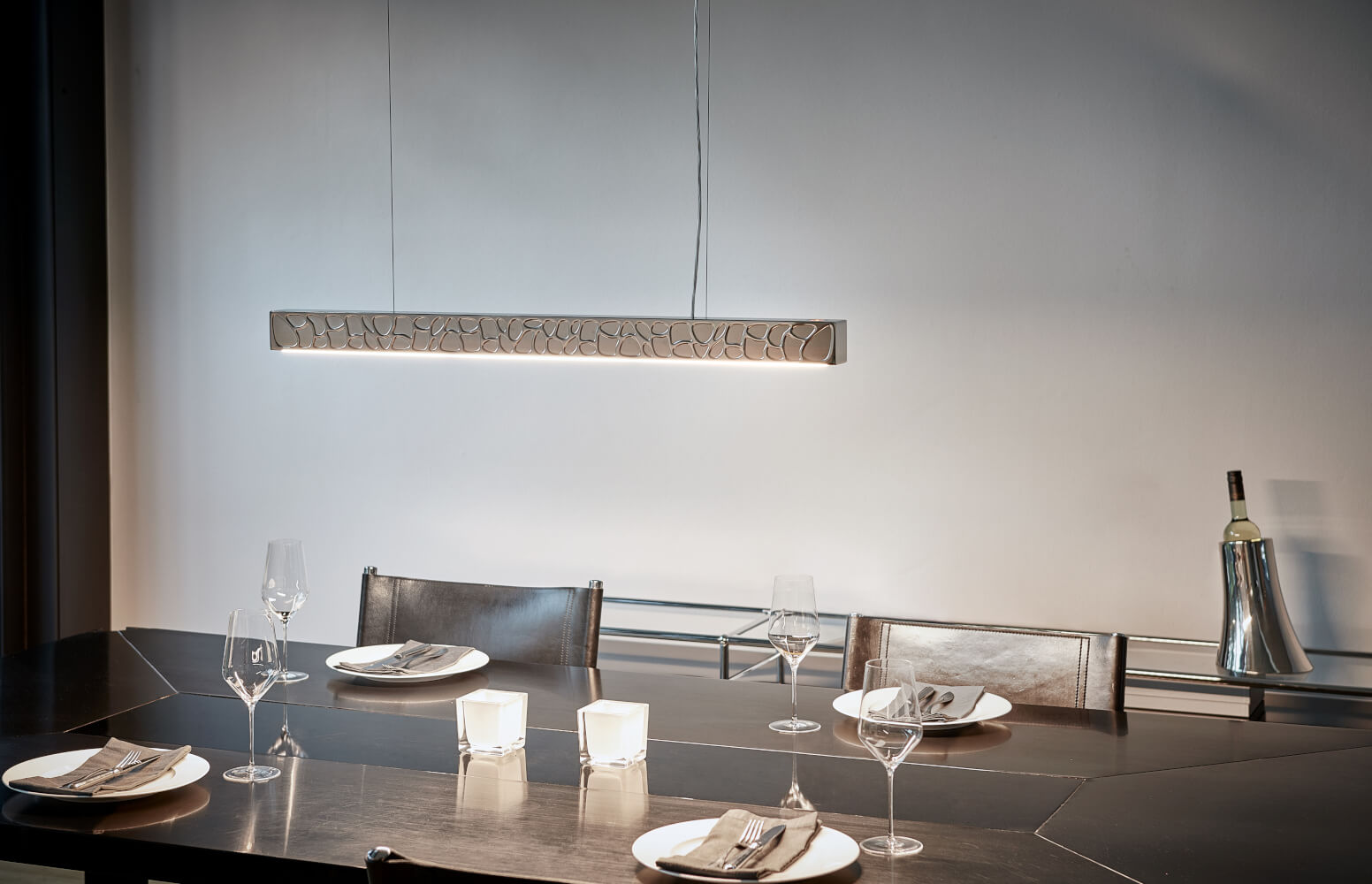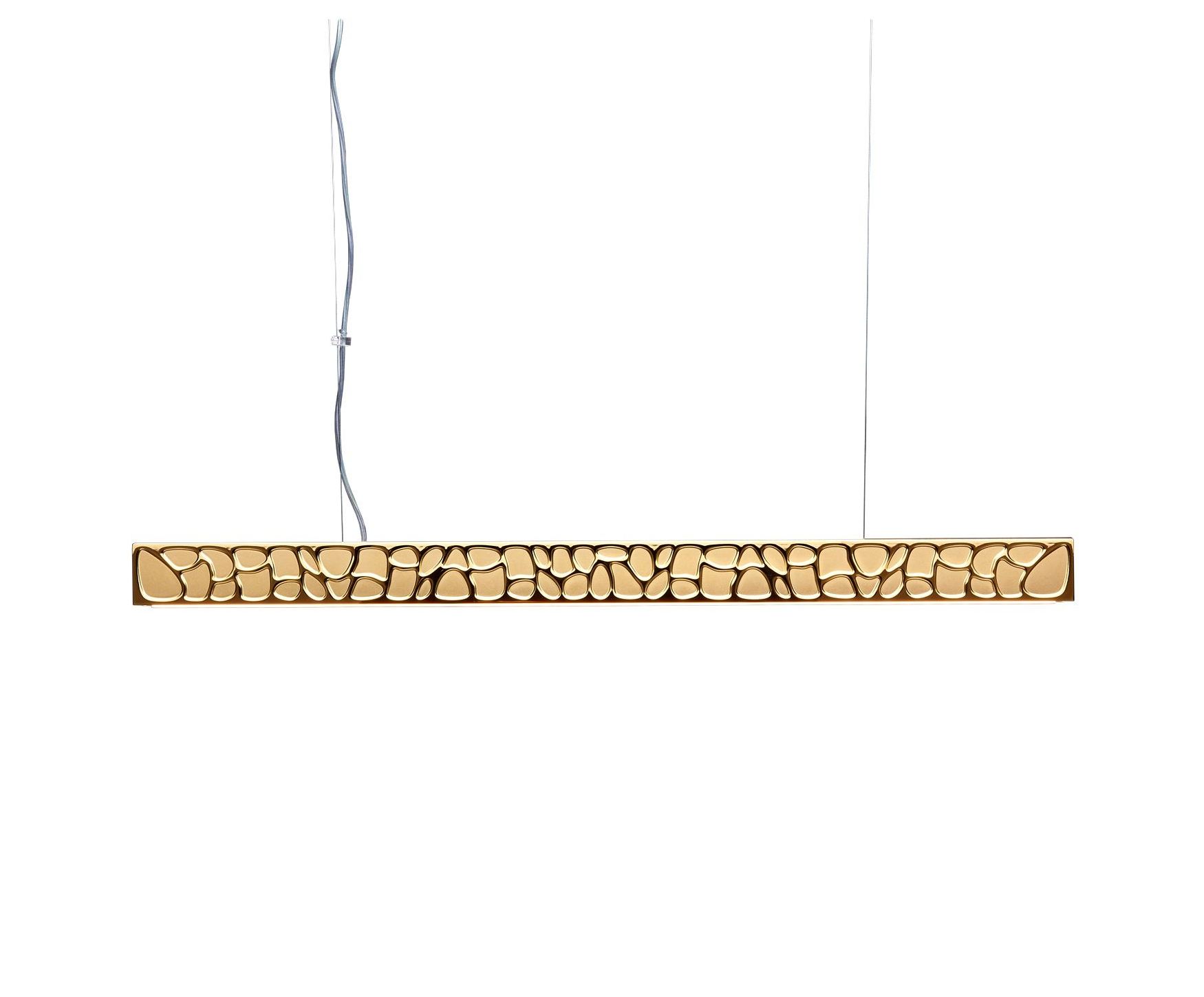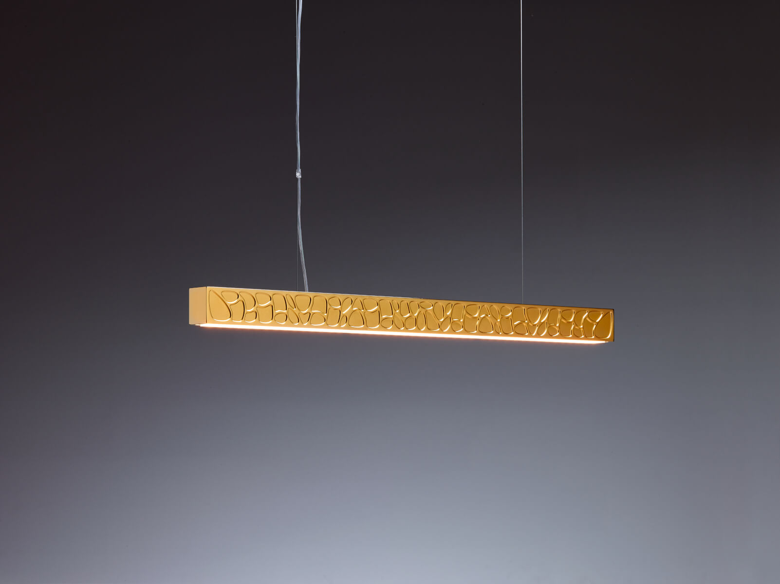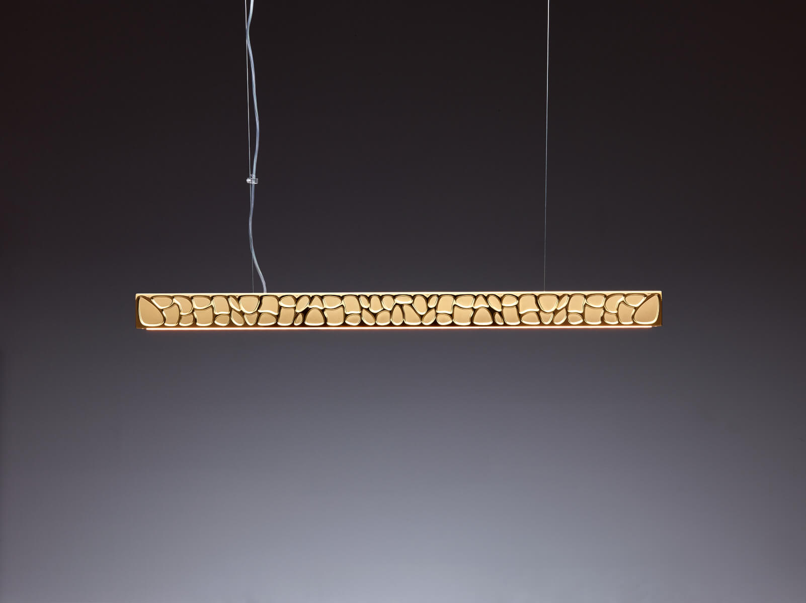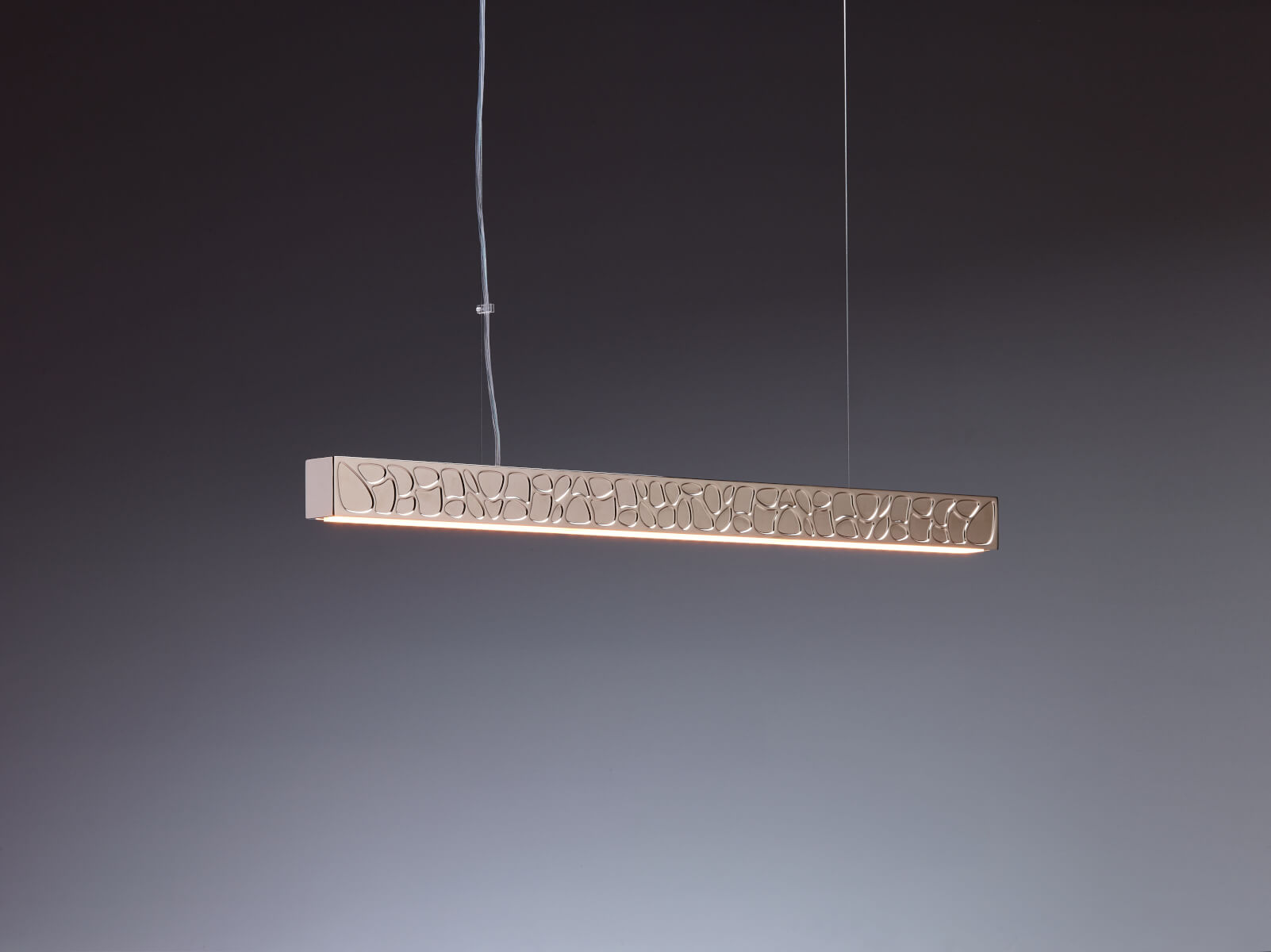 Bei der Materialwahl für der Theia Leuchten entschied man sich für Aluminium, das dem Leuchtobjekt eine gewisse Leichtigkeit verleiht. Die besondere Finesse ist das Finish, das einen leichten Bronzeeffekt erzeugt. Dafür wurde die Basis aus Aluminium vernickelt.Auf einer Länge von 90 cm, einer Breite von 5 cm scheinen die Konturen des Musters, das an Kieselsteine erinnert, deutlich hervorzutreten. Die Höhe des Lichtbalkens beträgt 6,5 cm.