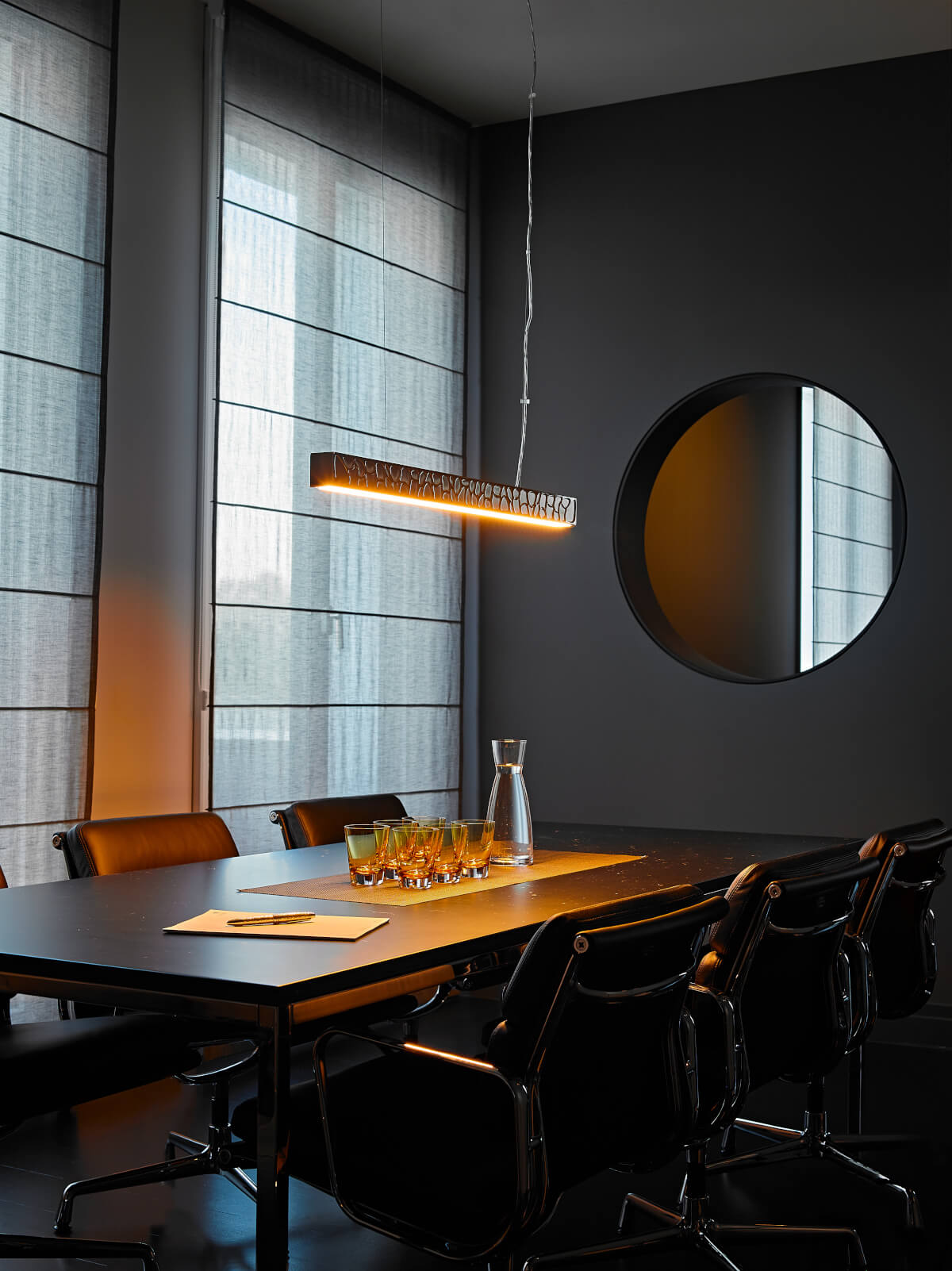 Bis zu 3 Meter schwebt die Tecnolumen Theia Pendelleuchte an der zarten transparenten Aufhängung herunter und leuchtet Esstisch, Konferenztisch, Bar oder Theke aus.